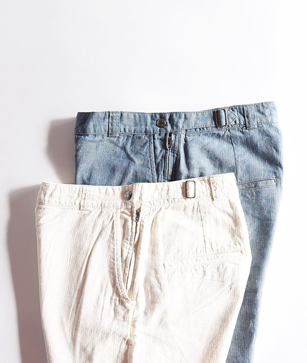 リネンコットン素材でヘリンボーン組織のシャンブレ―生地を使用した、軽やかな素材感が魅力のサイドジップパンツです。軽さがあるので、ストレスなく穿いていただけます。ウエスト位置を高くし、ほどよいテーパードで足長効果のあるシルエットに。またバックスタイルのベルトがデザインポイントなので、Tシャツやブラウスをインして穿いていただくのがおすすめです。
