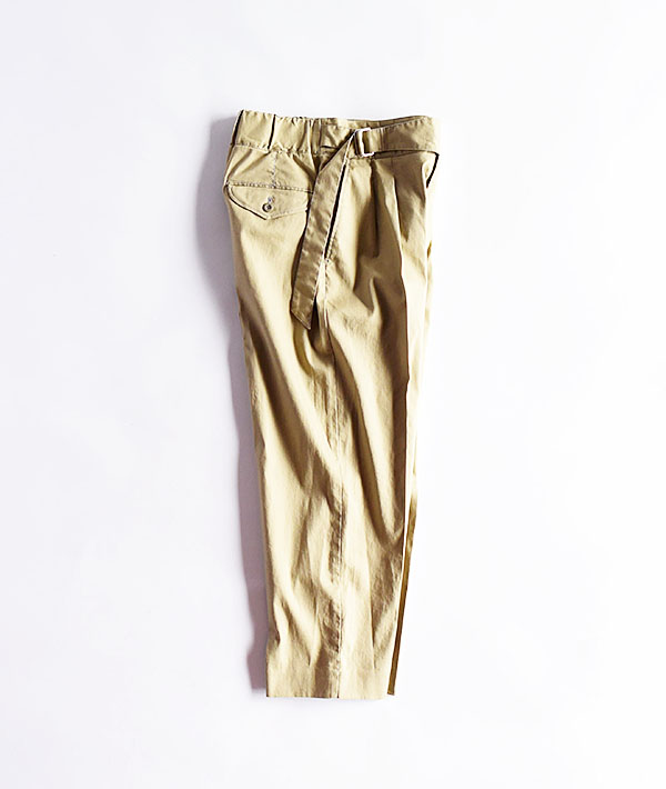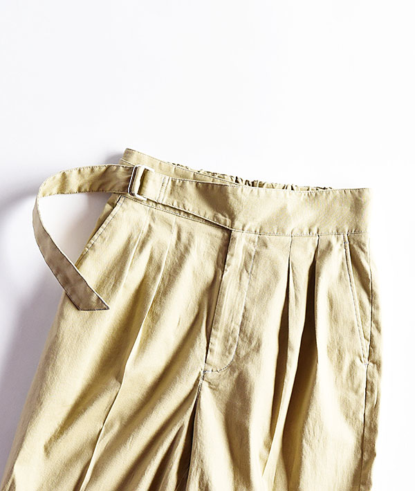 アーミーテイストをさりげなく取り入れたグルカパンツです。ベルトマーク部分は着こなしやすさを意識しながらも、フラップポケットのデザインやステッチカラーは古着を参考に微配色で効かせています。大人っぽくキレイなバランスを見極め、女性らしい丈感とシルエットに拘っています。程よくテーパードしたシルエットでサンダルとも相性の良い軽さのあるバランスに仕上がっています。