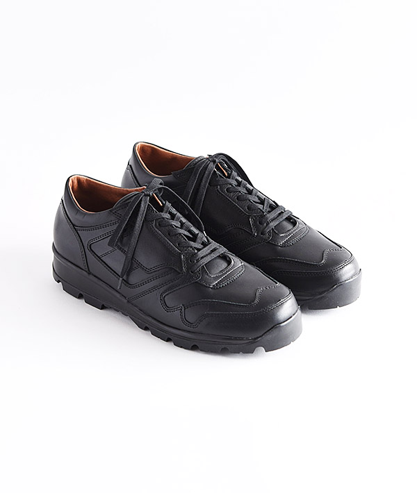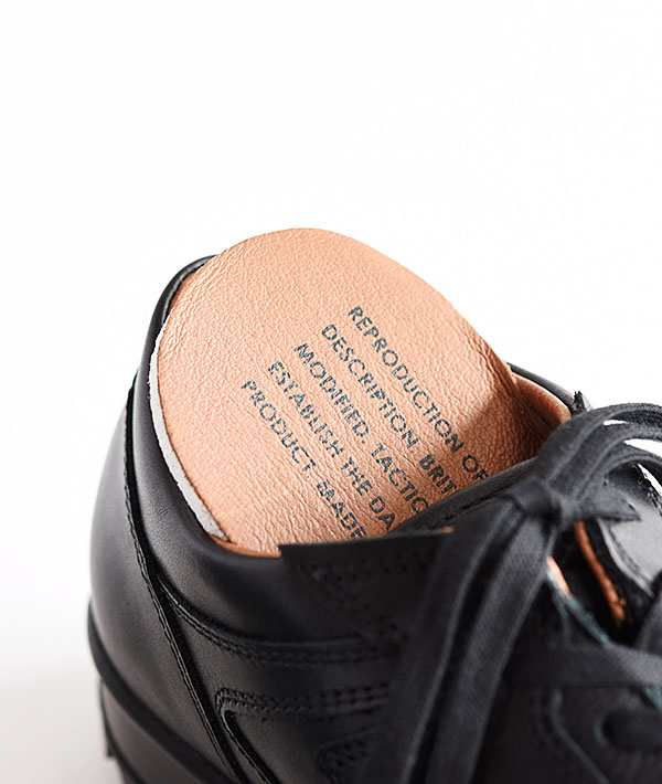 1990年代にかけてイギリス軍でトレーニングシューズとして採用されていたスニーカー「ブリティッシュトレーナー」。こちらは、TACTICALソール仕様のモディファイドモデル。耐衝撃吸収に優れたポリウレタンとラバーの2層構造の軍用ソールを採用しています。独特なカッティングが特徴的なアッパーは、耐久性に優れるイタリアンフルグレインレザー、ライニングとインソールは、ピッグレザーを使用しています。厚みのあるEVAを搭載したソールはミリタリーアイテムならではの機能性と履き心地を感じさせます。