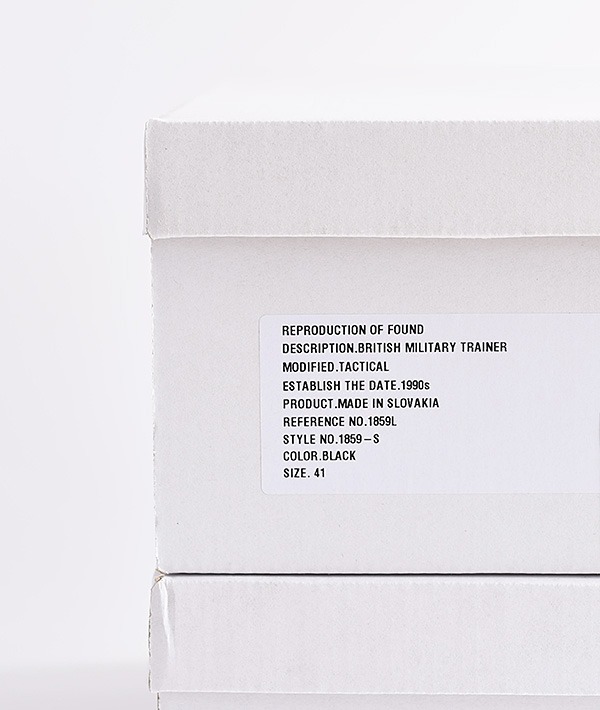 見つけ出す:FOUND、再現する:REPRODUCTIONをコンセプトに2016SSよりスタートしたシューズブランド。ミリタリートレーナーシリーズは1950年代~1990年代にかけて数多くの軍用トレーニングシューズを生産していた各国のファクトリーで、ひとつひとつ丁寧にハンドメイドで生産されています。ロゴやタグには品名、国名、年代を記載しデザインソースを明かしています。ミリタリーアイテムを中心に時代を超えた普遍的なアイテムを見つけ出し、現代的に再現させてリリースしています。