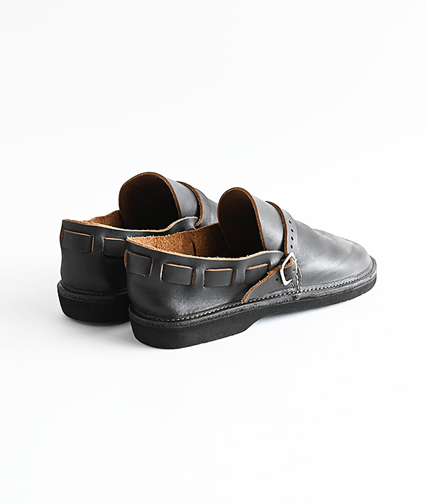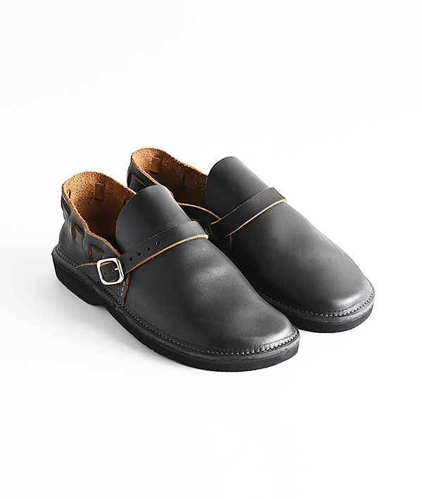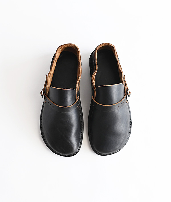 柔らかな曲線のラウンドトゥにレザーストラップがヒールまでグルっと1周したシンプルなデザインが特徴。独特のカーブを描く、ふっくらと丸いラウンドトゥのつま先は、職人が1足ずつ湯に浸しながら成型する独自のハンドメイド製法で仕上げています。
