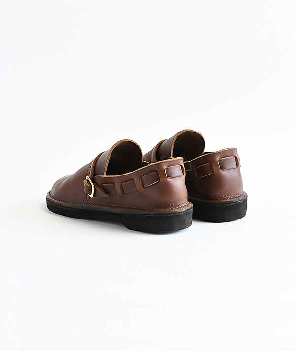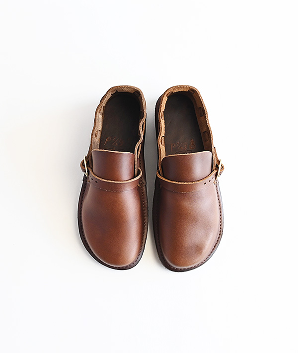 柔らかな曲線のラウンドトゥにレザーストラップがヒールまでグルっと1周したシンプルなデザインが特徴。独特のカーブを描く、ふっくらと丸いラウンドトゥのつま先は、職人が1足ずつ湯に浸しながら成型する独自のハンドメイド製法で仕上げています。