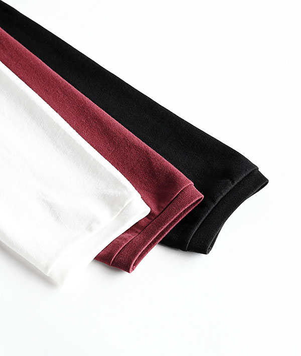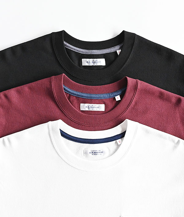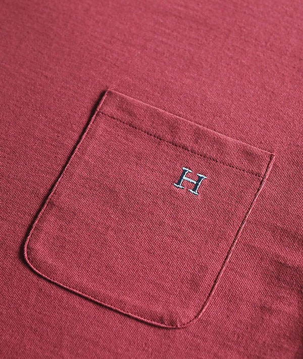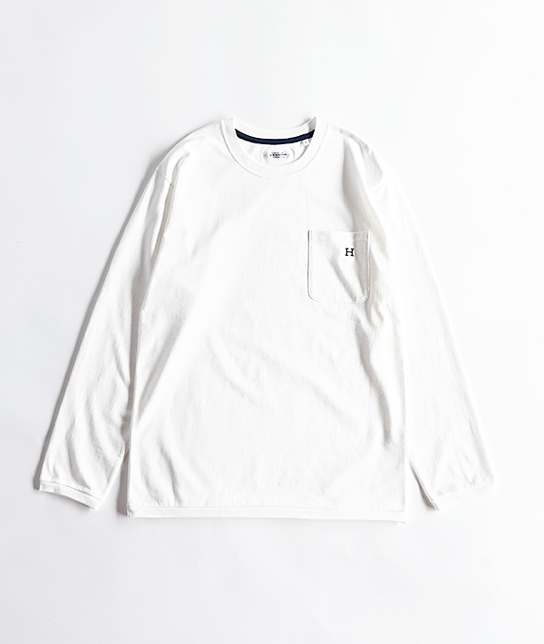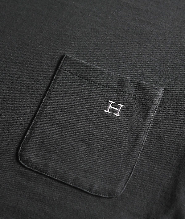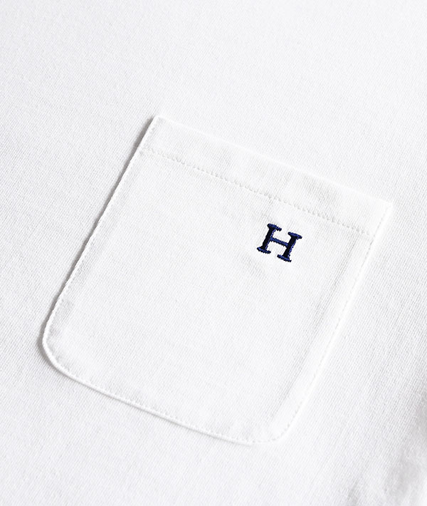 太番手の空紡糸を使用しているため、独特なシャリ感と柔らかさを持ち合わせたこの生地は吸水性・速乾性にも優れているので着心地も快適です。胸にあしらわれたH刺繍はもちろんのこと、袖と裾のナローリブもポイントです。