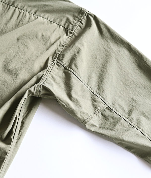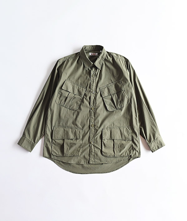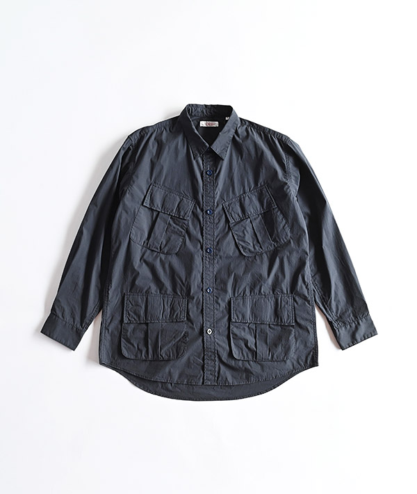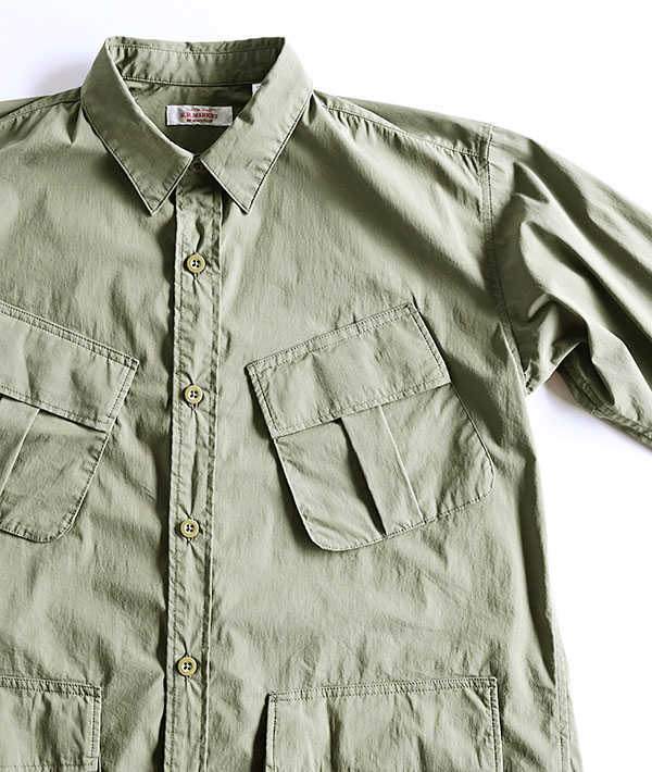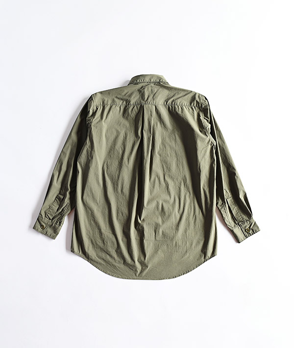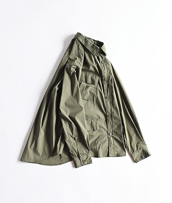 U.S.MILITARYのジャングルファティーグジャケットをモチーフにしています。ハリのあるブロード生地を使用することで、ライトアウターの様なスタイリングも可能になっています。前身頃の4つのポケットは収納力も高く実用的。脇下にはベンチレーションも備わっています。