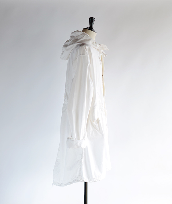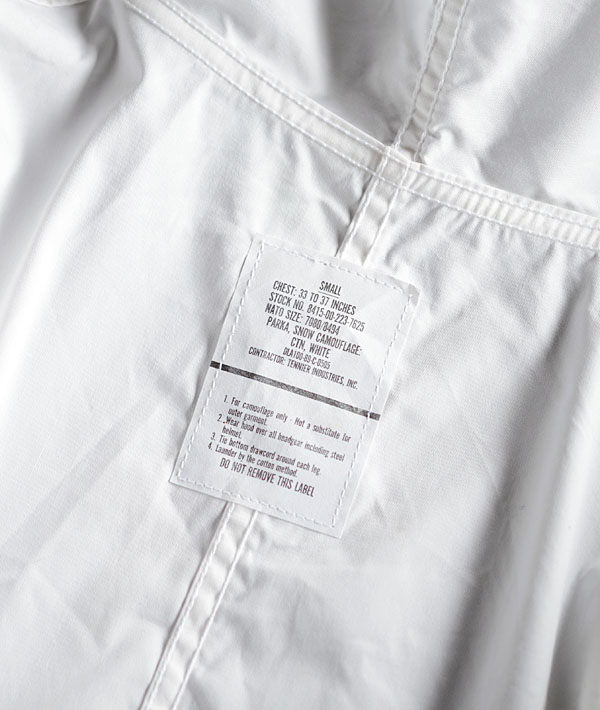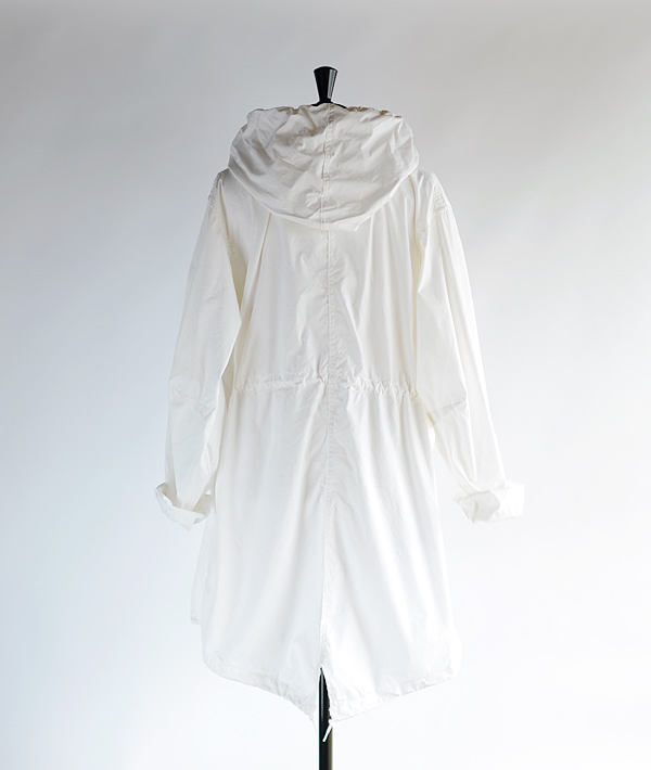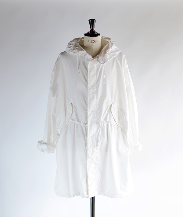 降雪エリアのフィールドでジャケットなどの装備の上から着用する目的で作られたオーバーコートです。その為、カモフラージュ効果があるオールホワイトで製作されています。モッズコートのオリジナル「M-51」と同様のディティールでフード一体型、バックはフィッシュテールのUS.ARMY特有のデザインです。フロントはフラップポケット(ポケットスレーキなしのスルーポケット仕様)。