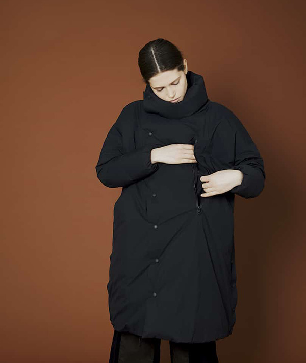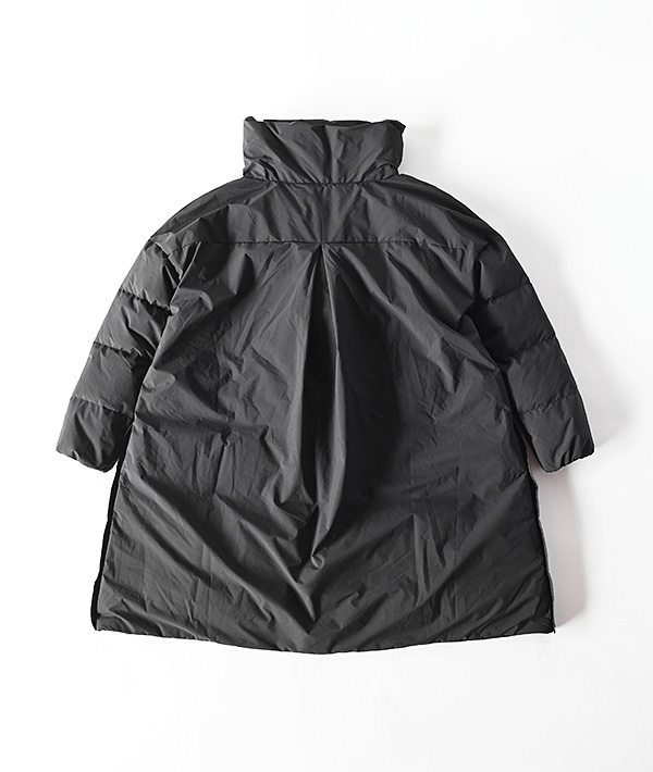 F/CE.のNANGAエクスクルーシブのスタンドセミロング ダウンコート。ドロップショルダーの丸みのあるデザインが特徴。裾に施されているドローコードにより容易なシルエット調整が可能。サイドのスナップファスナーによりスリッド&ベンチレーションの開閉が可能。