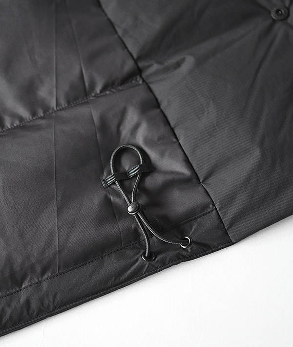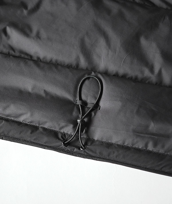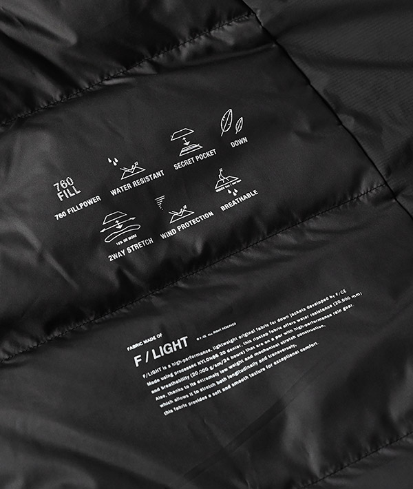 ヨーロッパ産の高品質原毛を職人の手により一つ一つ羽毛をハンドピックで見極め、優れた検査・技術により洗浄された国内精製羽毛を使用。高品質ダウンは羽毛本来の温湿度調整機能が非常に高く丈夫で、羽毛特有の匂いがありません。表地はF/CE.がダウン向けに開発したハイスペックオリジナルファブリック「FLIGHT/エフライト」を使用。同ファブリックはNYLON66 20Dの加工糸を使用したリップストップファブリック<耐水圧20,000mm、透湿性20,000g/sm/24hours>というハイエンドレインウェアと同様のスペックを持ち、高い透湿防水性を実現した機能素材。軽量でメカニカルストレッチ素材のため、ソフトでなめらかな風合いを保ち、高機能且つ着心地にもこだわった希有なファブリックです。