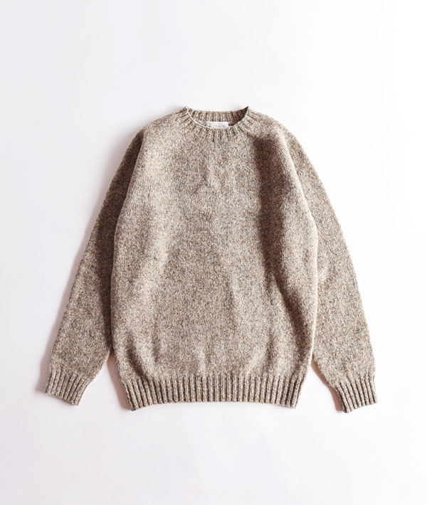 インバーアランの伝統的なシェットランドウールを使用したニットです。シェットランドは英国羊毛をベースに紡績される最も伝統的なウール糸の一つで、英国羊毛の持つオリジナルの色調を最大限に生かし、最新の色合いもブレンドした絶妙なミックスの色が特徴です。シェットランド糸は英国国内で紡績、最終仕上げされている糸を使用しています。その貴重な英国糸をスコットランドでフルファッションやジャガード機などの伝統的な機械により、インバーアランの伝統的なニッティングパターンを忠実に編上げハンドフィニッシュしたものがこのニットです。