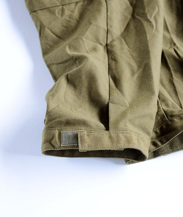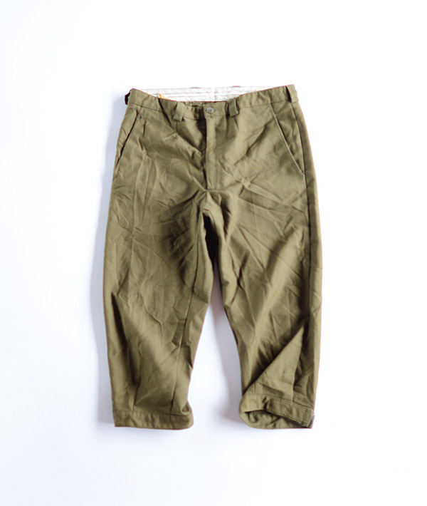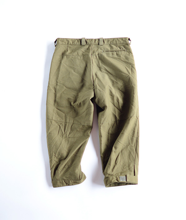 レングスが膝下までのクオーター丈。ゴルフ・自転車・アウトドアなどのクラッシックなスポーツウェアとしてもデイリーウェアとしても楽しめる。クラシカルで非常に雰囲気のあるボトムスです。フロントセンターはボタンフライ又はジッパーのアソートとなります。裾はベロクロのストラップで調整可能。カラーは、オリーブがかったブラウンカラー。年代は1992年製です。