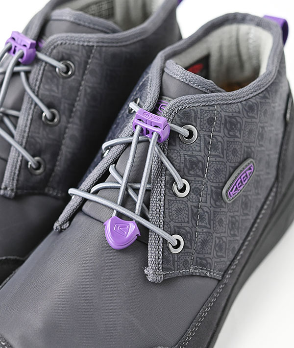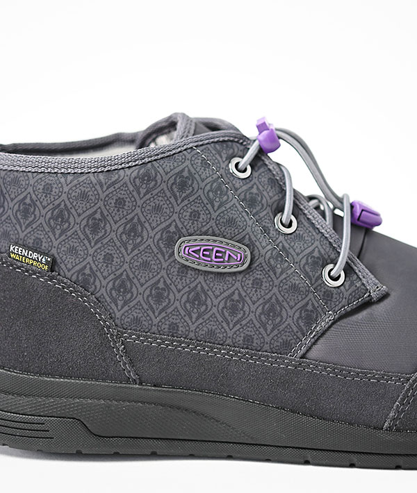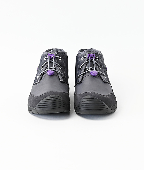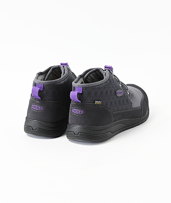 rajabrookeのインスピレーションの根源でもある “東南アジア”を感じるバティック柄をモノトーンで落とし込み、バンジーコードのトグルとアローヘッドにパープルの差し色を配した、唯一無二なカラーリングに仕上げています。KEENウィンタースニーカー「HOODCHUKKA WP」はインサレーション入りのナイロンアッパーと独自保温素材KEEN.WARM(キーンウォーム)で保温性を確保し、低温環境においてグリップ力を発揮するフリーズラバーアウトソールを採用した、脱ぎ履きが楽なスリッポンタイプのチャッカブーツです。KEENならではの機能の数々とrajabrooke の世界観が落とし込まれた1足です。