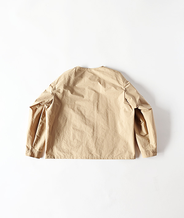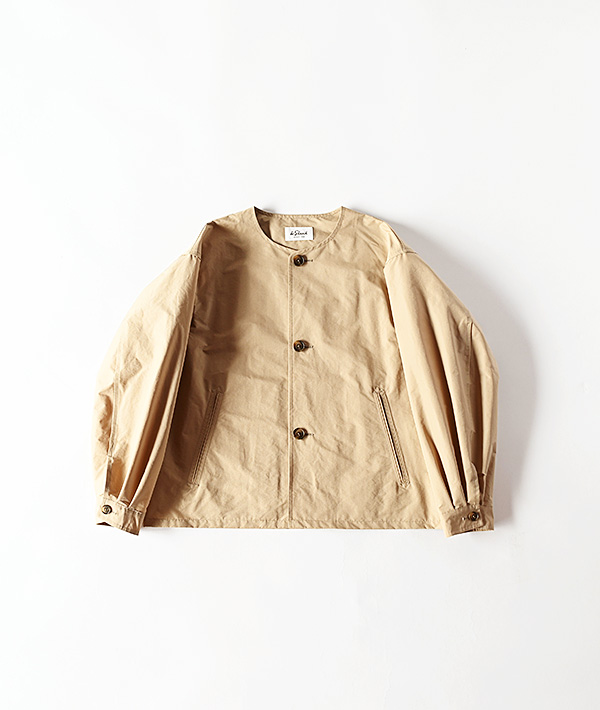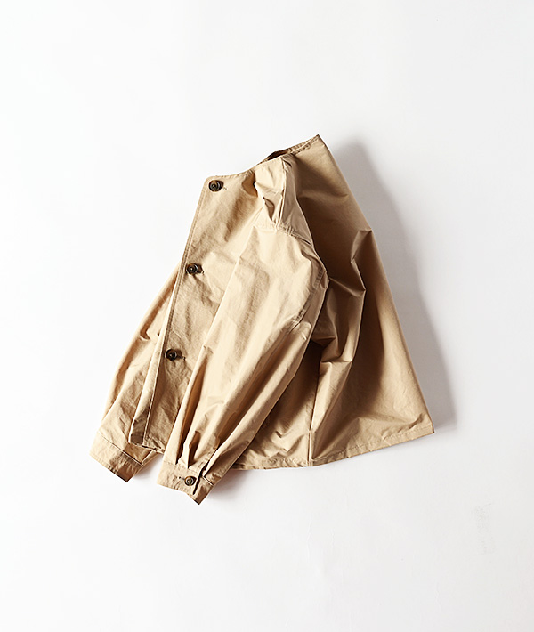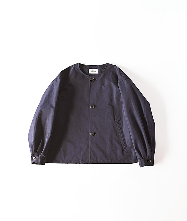 カーディガンのようなフロントデザインが印象的なノーカラーブルゾン。やや光沢のある上品な風合いとハリ感のある国産ポリエステルタフタを使用。程よくゆとりのあるサイズ感でドロップショルダー、オーバーサイズシルエットになります。
