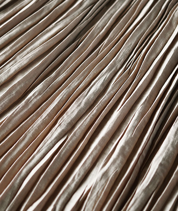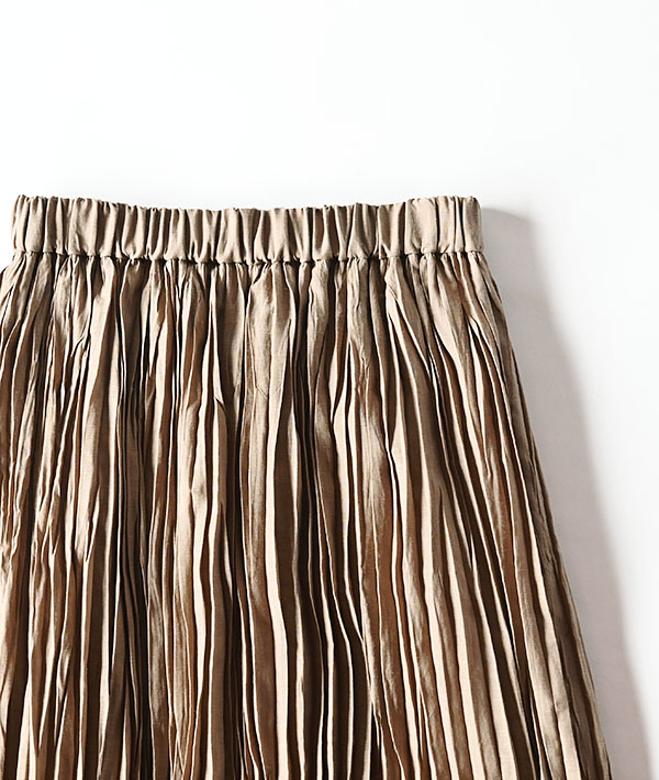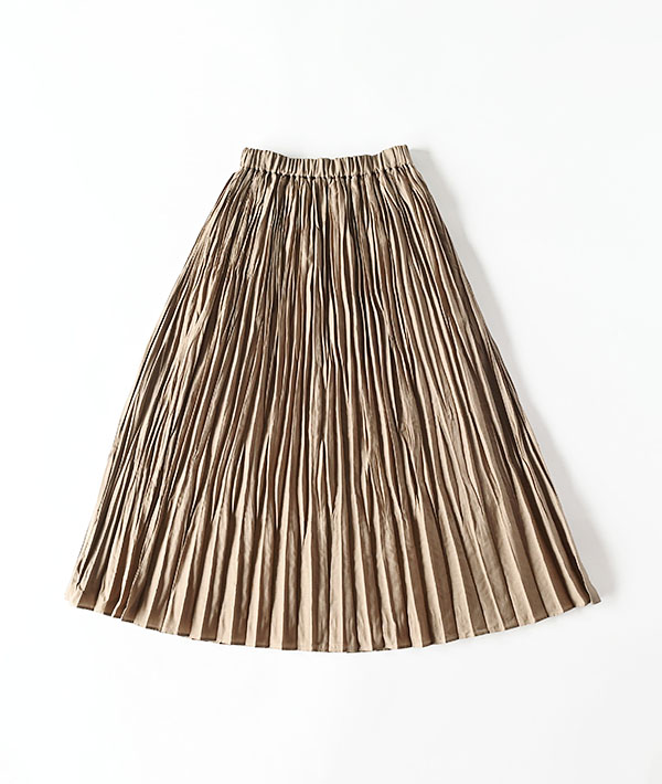 スラブ糸による麻らしいナチュラルな表情と薄手でほどよい透け感のあるエアリーさが特徴のローン素材を使用したロングスカートです。一つ一つ手作業でシワを寄せてプリーツ加工を施しています。表情の違うランダムなシワ感に拘り、軽やかに清涼感のある風合いに仕上げています。