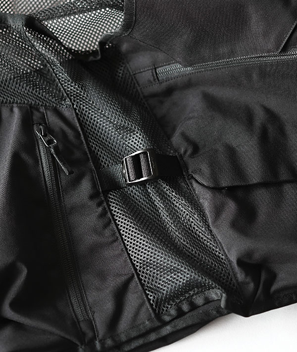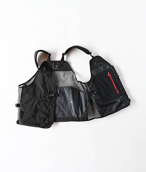 手ぶらでアウトドアを楽しめる収納力の高いベスト。収納スペースを広げるダーツ入りのポケットや、貴重品の収納に便利なジッパー付きポケットなど、大小さまざまなポケットを合計10個備えています。表地には耐久性のある地厚なナイロンオックス素材、脇と背面にはポリエステルメッシュを使用することで通気性を確保しています。パッド入りのショルダーハーネスを採用し、長時間使用する際の肩への負担を軽減。ショルダーとウエストはバックルで簡単にサイズ調節が可能。キャンプシーンはもちろん、ちょっとした外出にもバッグを持たずに行動できる、日常使いにも活用できるアイテムです。