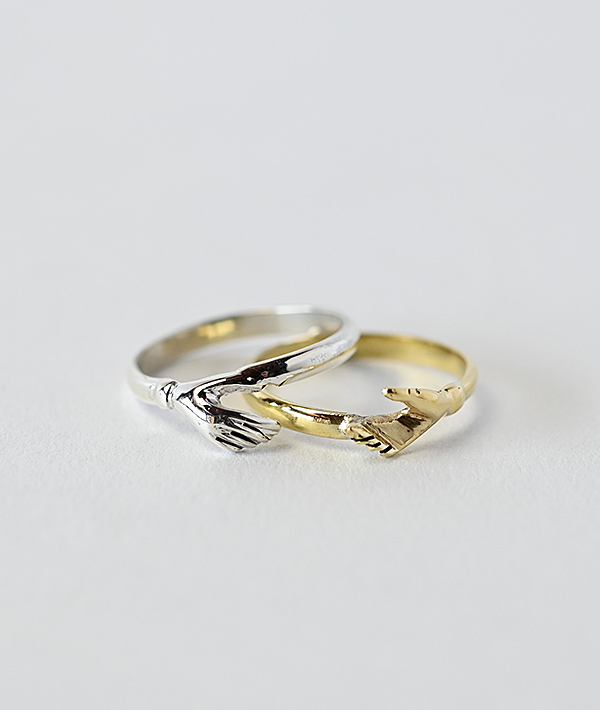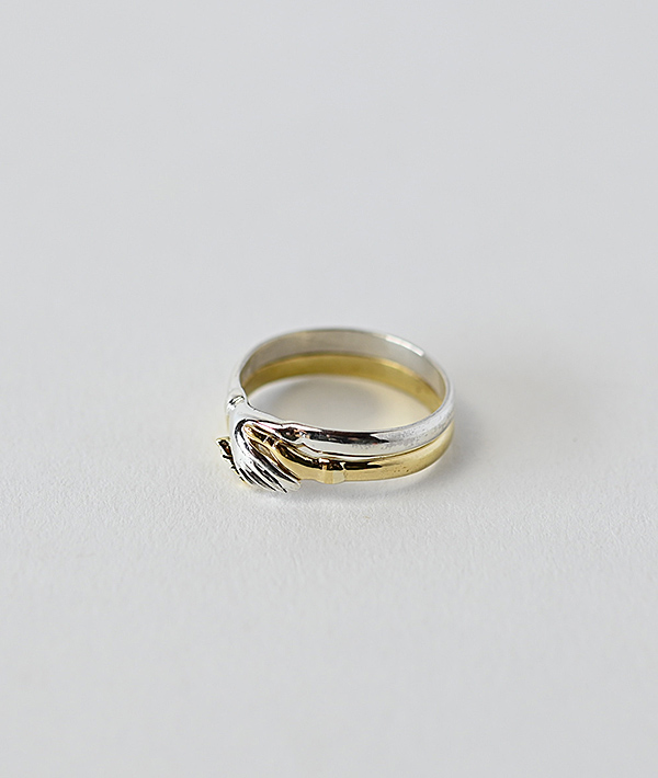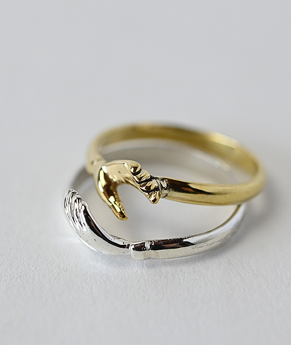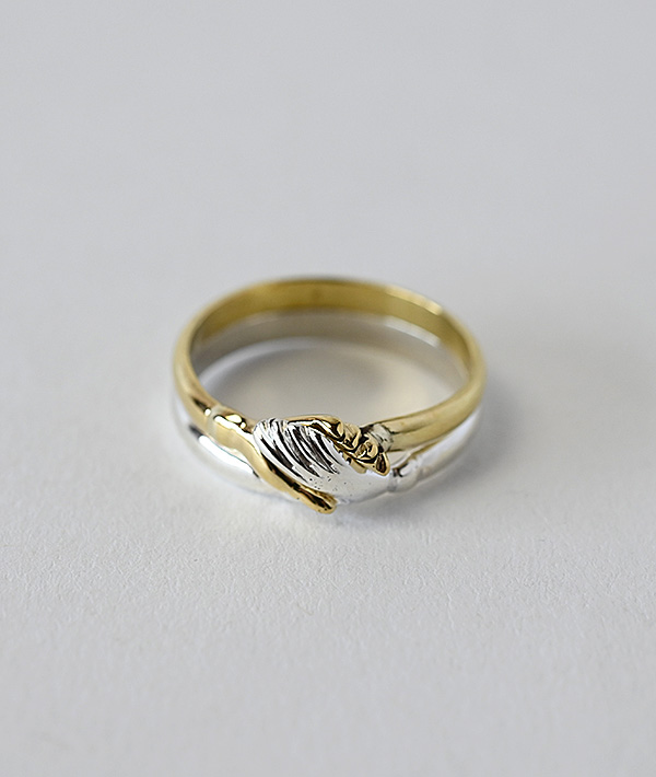 スターリングシルバーとブラスの異なる素材を重ね合わせて、シェイクハンドを象ったピースフルなデザインのリングです。