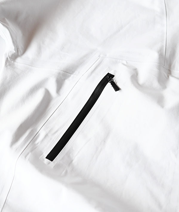 アウトドアでの視認性を高めるカラー製品を、あえて無染色素材で。製造工程のなかで最も水を必要とすると言われる染色を行なわない素材を主に使用し、素材そのものの色を生かしたコレクションです。軽さと堅牢さをバランスよく兼ね備えたGORE-TEX PRODUCTS 3層素材を採用。75デニールのリサイクルポリエステルの無染色基布と、原着糸のトリコットバッカーの組み合わせにより、適度なハリ感と肌触りを追求しています。シンプルなデザインのアノラックは、ややユルめのサイズ感。左胸のエンボスロゴもデザインのアクセント。さまざまな機能性を持ちながら、タウンユースにも適したデザイン性を取り入れた1着です。