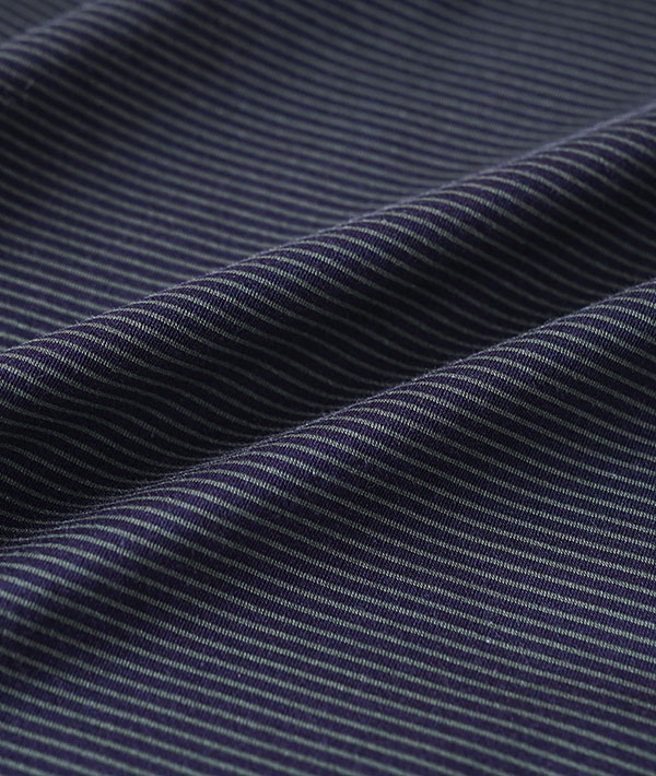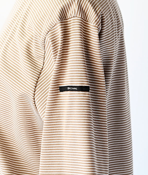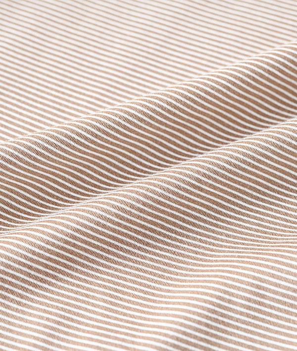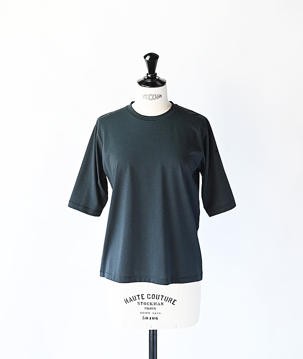 ボーダーラインが入った共地の衿が特徴的なハーフスリーブTシャツ。60番手の双糸のスーピマ原料を使用。風合いを損ねないようにナチュラルなシルケット加工を施しています。しっかりとした生地感でありながら、柔らかさも兼ねた着心地の良い一枚です。
