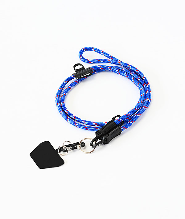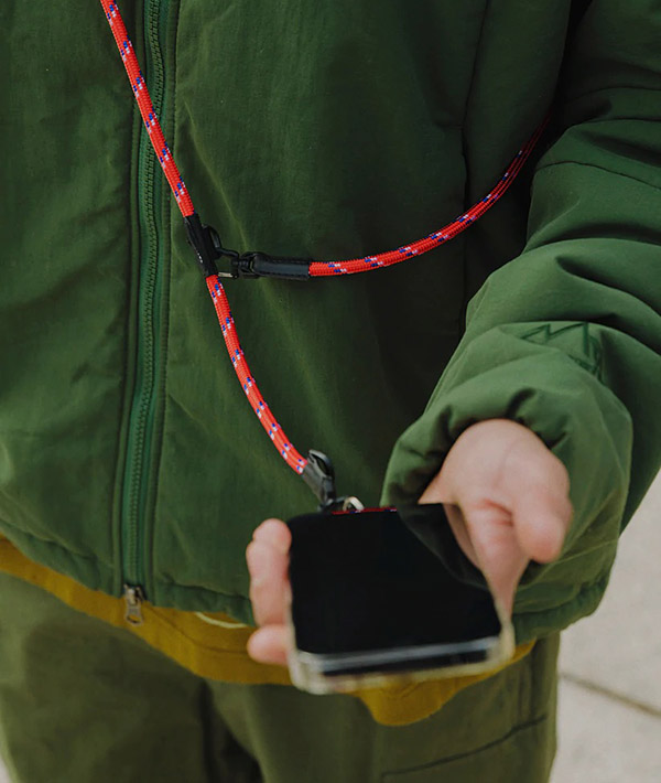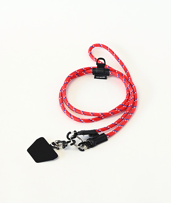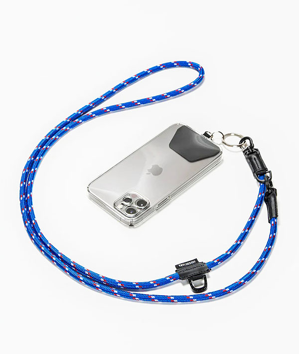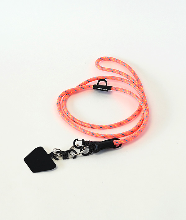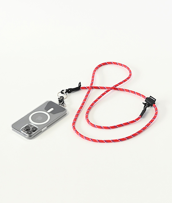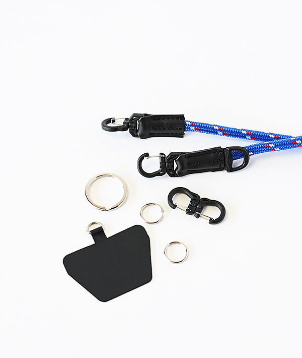 直径6mmのアウトドア用のロープを使用したモバイルストラップ。2箇所に設置したDリングとフックを組み合わせて、使いやすい長さや向きに調節可能。スマホだけに限らず、付属するリングやダブルフックを使用して、鍵や財布、ポーチなどのストラップとして様々なアレンジが可能です。
