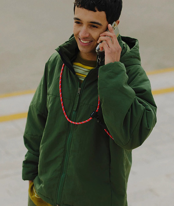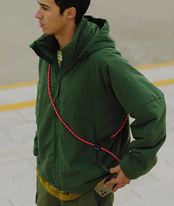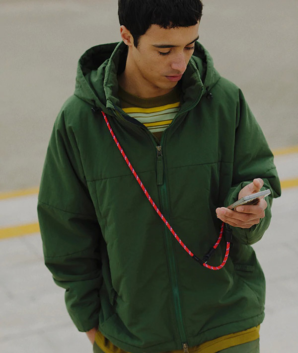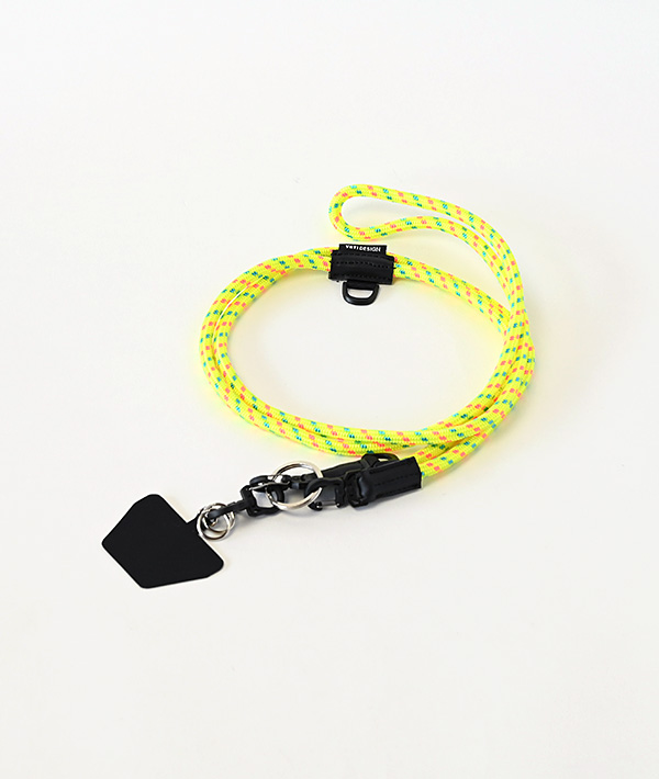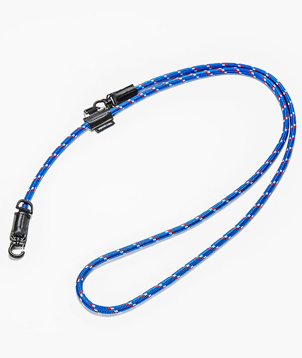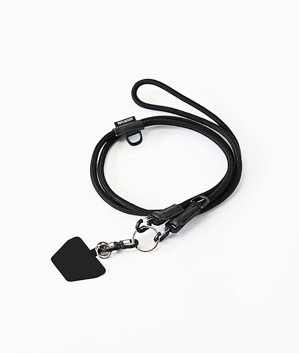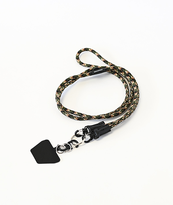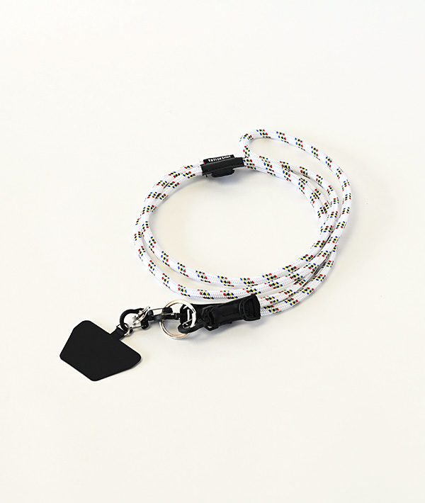 直径6mmのアウトドア用のロープを使用したモバイルストラップ。2箇所に設置したDリングとフックを組み合わせて、使いやすい長さや向きに調節可能。スマホだけに限らず、付属するリングやダブルフックを使用して、鍵や財布、ポーチなどのストラップとして様々なアレンジが可能です。