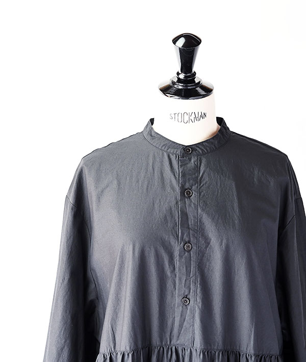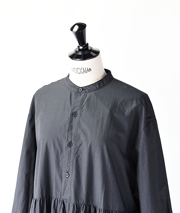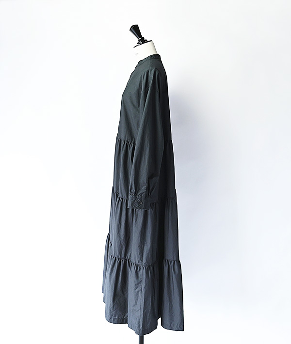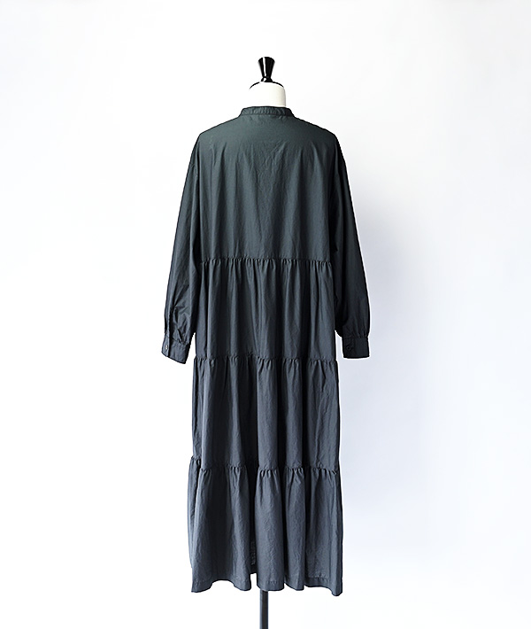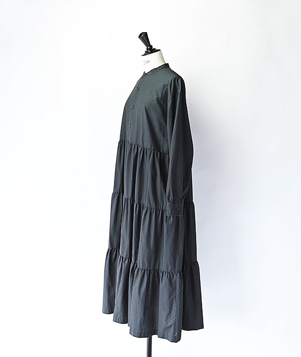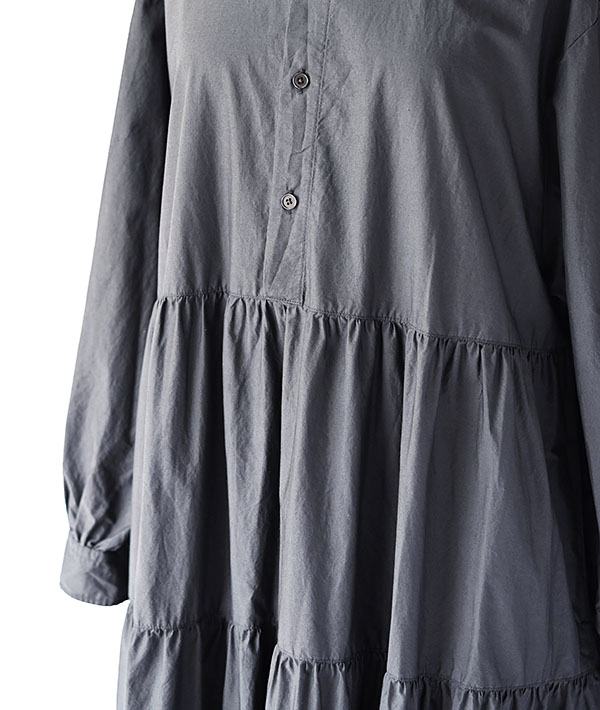 特殊加工を施したタイプライター生地をふんだんに使用した3段ティアードのプルオーバーワンピース。ボリュームのあるティアードに細めの衿と濃茶のタイラギ釦が映える存在感ある1着です。