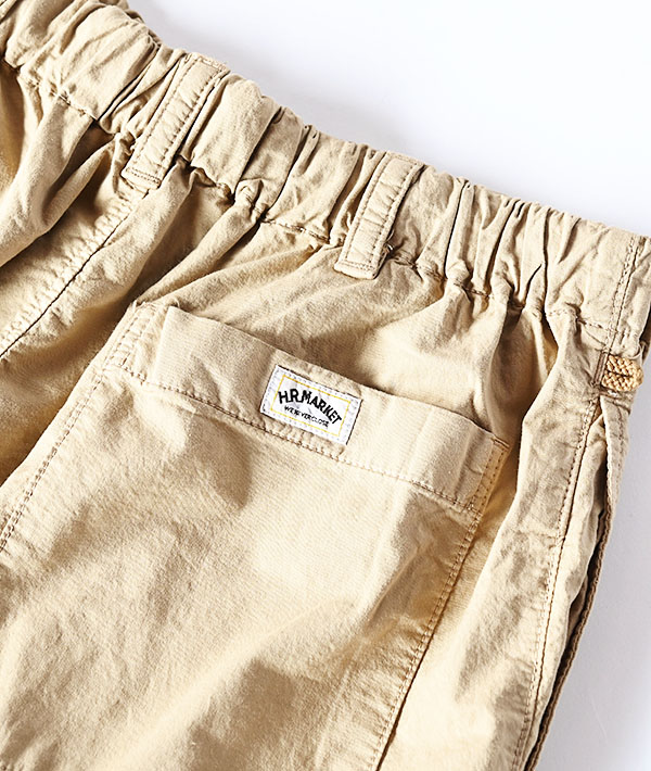 ハリウッドランチマーケットのオリジナル素材「Back pile fabric」を使用。見た目は清涼感のある薄手の生地にみえますが、特殊ドビー織機により、複雑な組織織りとストレッチで織られたニ重織りの裏パイル生地を使用しています。また綿は、スーピマコットンの60/1をタテ糸に使用し超長綿のソフトな風合いがストレスを感じさせない着心地を可能にしています。通気性が良く吸湿性に優れたパイル生地を夏場のレジャーシーンにも活躍するアイテムで表現しています。