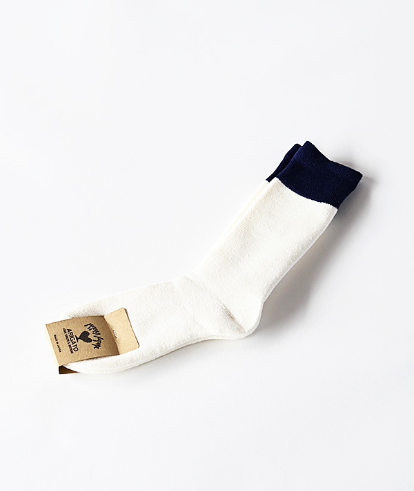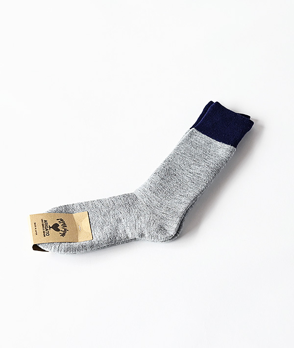 ミリタリーソックスをイメージした2トーンソックス。ウールブレンド素材で空気を含んだ軽くて温かみのある風合いです。内側がパイル組織になっていて肌触りとクッション性の良いソックスです。