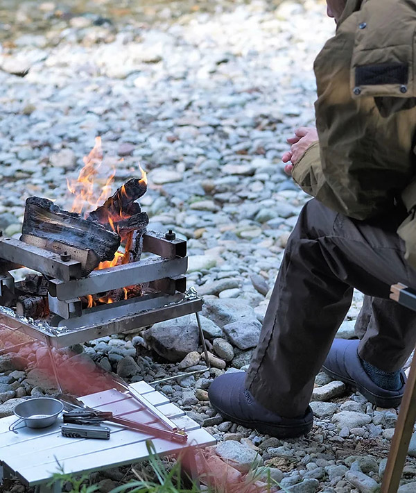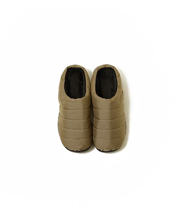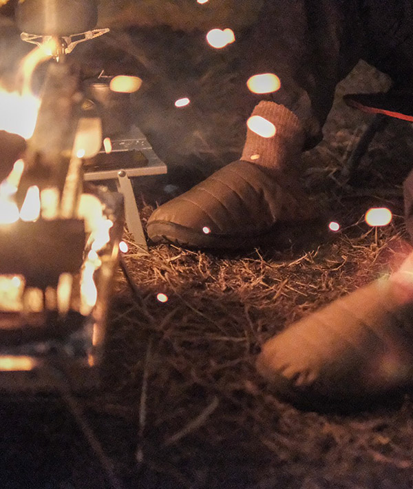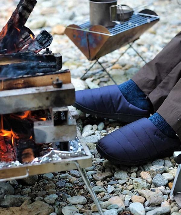 難燃性のCORDURA305D素材を表地に使った、キャンプシーンにも最適な一足。ダウンのような暖かさで、素足をつつみ込み、起毛加工の内側の生地と4層構造のインソールが、足全体に抜群のフィット感を生み出し、優しい履き心地をつくりだします。軽くて丈夫なCORDURA素材は、撥水性の高さ、耐久性も優れています。ワンマイルシューズやルームシューズとしてもお勧めです。※同素材のスタッフサックが付属します。