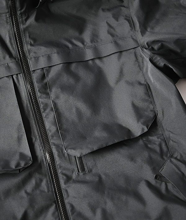 フードは収納型でスタンドカラーとしても使用可能。ミリタリーテイスト漂う胸部の立体3Dポケットが特徴的。左下にはジッパーポケット付。フロント胸部には全部で5ポケットを配置。両サイドにもハンドフロントポケットを備えています。また、カフス部のアジャスターがとてもスムーズでグローブ着用時でもストレスのないアジャストを可能にしています。機能性はもちろん、デザインの良さが際立つジャケットです。