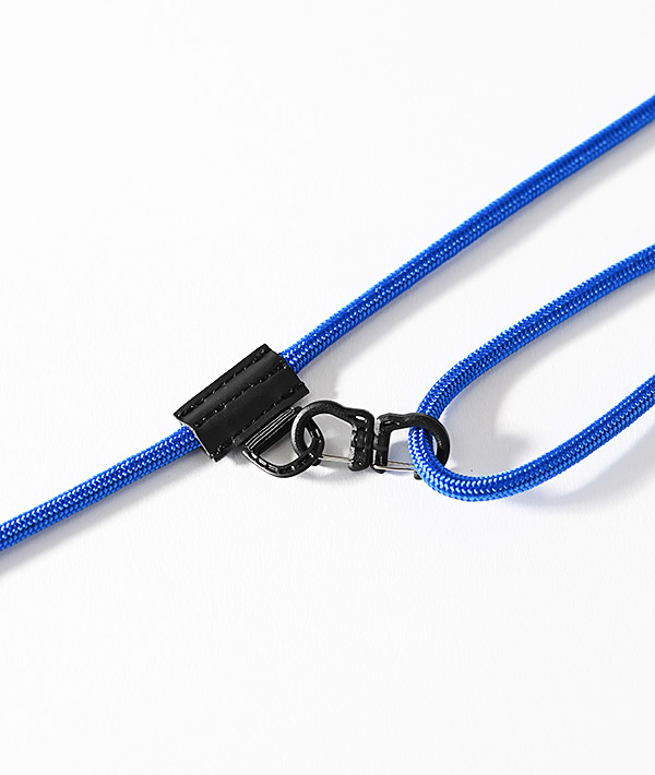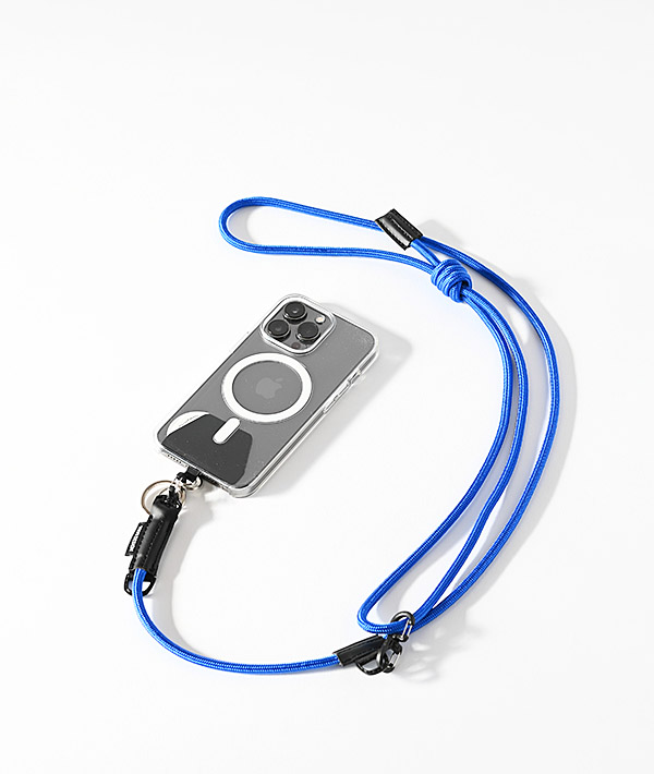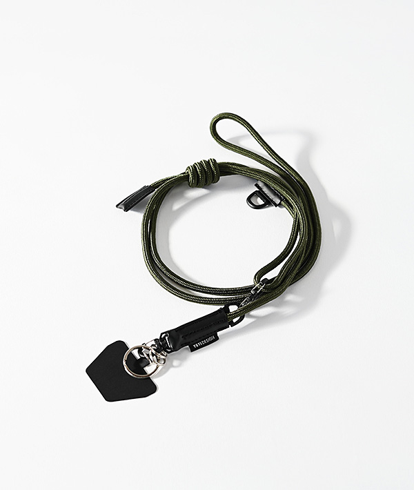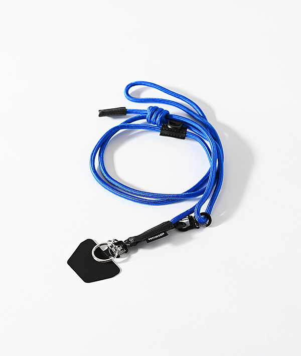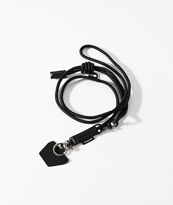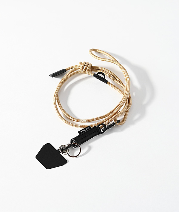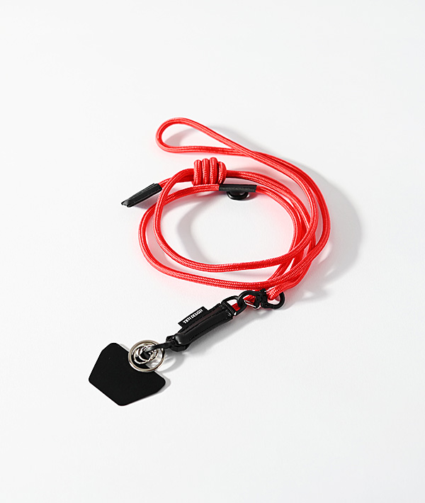 直径5mmのナイロン製クライミングロープを使用したモバイルストラップ。クライミングロープの代表的な結び方の「フリクションヒッチ」仕様にすることで、結び目をスライドさせる事により長さの調整が無段階に可能。スマートフォンだけでなく、付属するリングやフックを使用して鍵や財布、ポーチなどのストラップとして様々なアレンジが可能です。