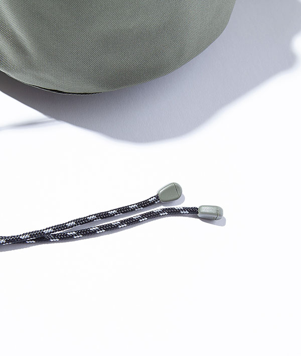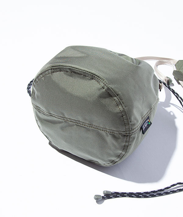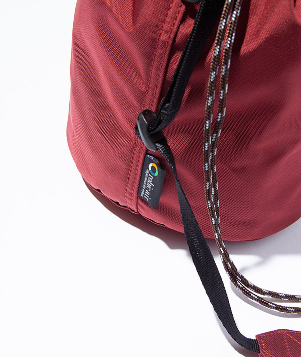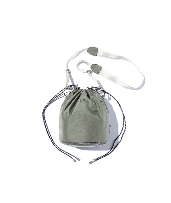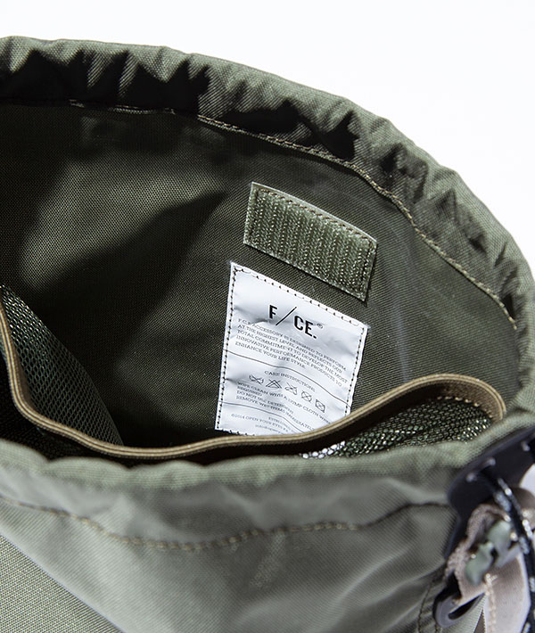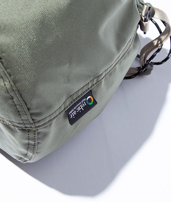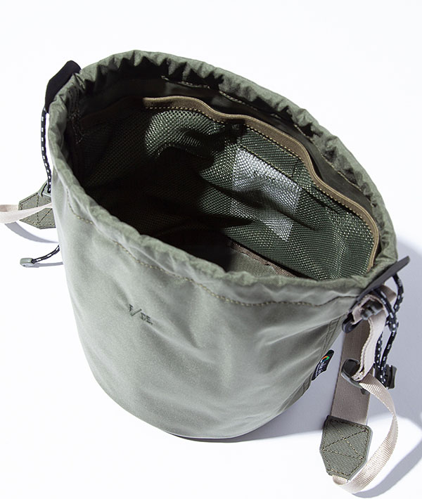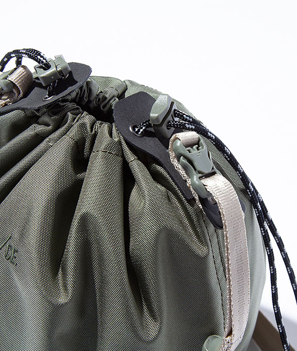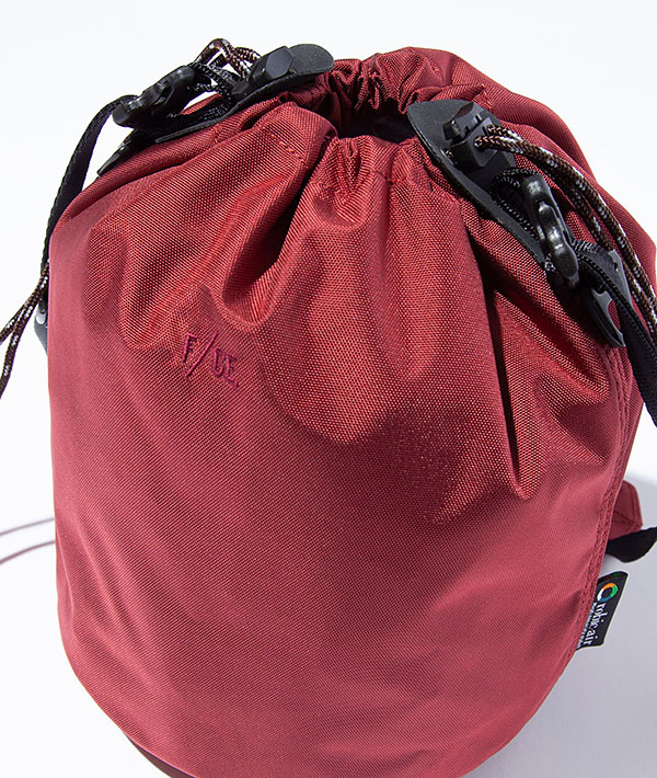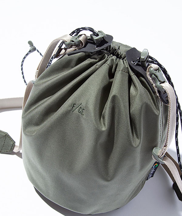 軽量で耐久性に優れた素材「Robic Air」を使用したドローストリングバッグ。巾着型にショルダーストラップを付属。底面を楕円状にし、適度な容量を確保しています。軽量アルミニウムパーツや本物のシートベルト素材の高強度ウエビングテープを用いるなど機能的な仕様。ロービックエアー素材のもつマットシャイニーなレトロな表情も魅力です。FCEのバックパックと連結可能なMOUNTING T SYSTEMに対応しています。