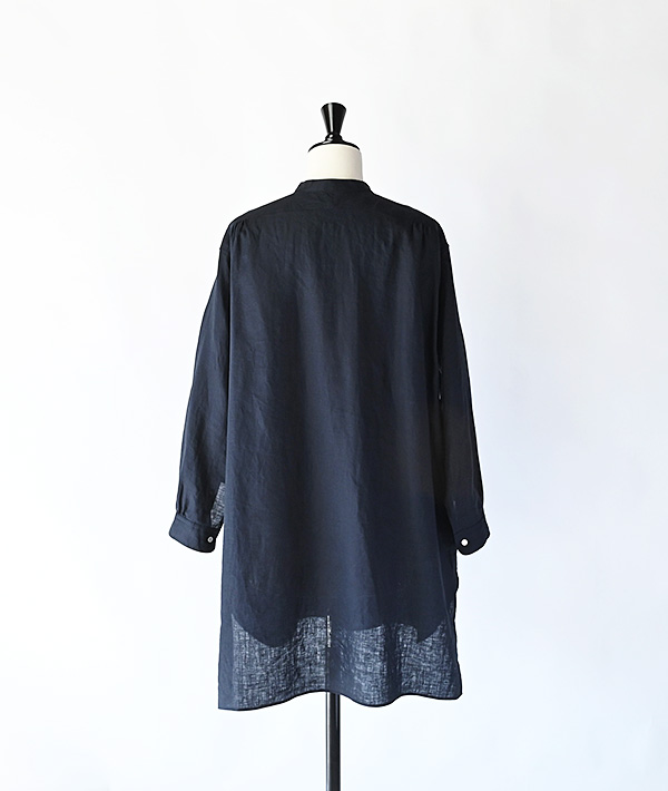 メンズのヴィンテージシャツをベースにデザインされたスタンドカラーシャツ。上質なリネン原料を使用しクラシカルな雰囲気を演出。袖の可動域を広げるガゼットやギャザーを施し細部のディテールにも深みを加えています。極細番手の生地はエアータンブラー加工を施すことで、膨らみのある柔らかな印象に仕上げられています。