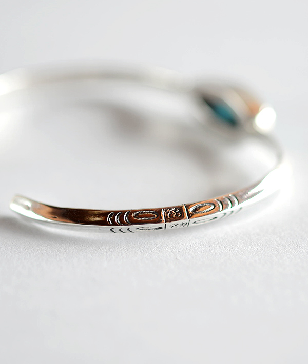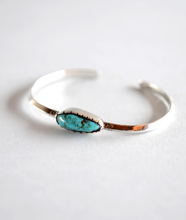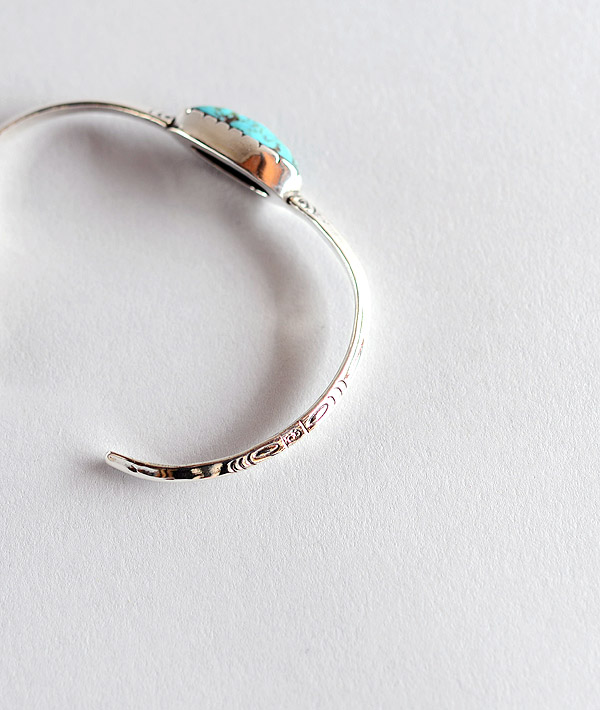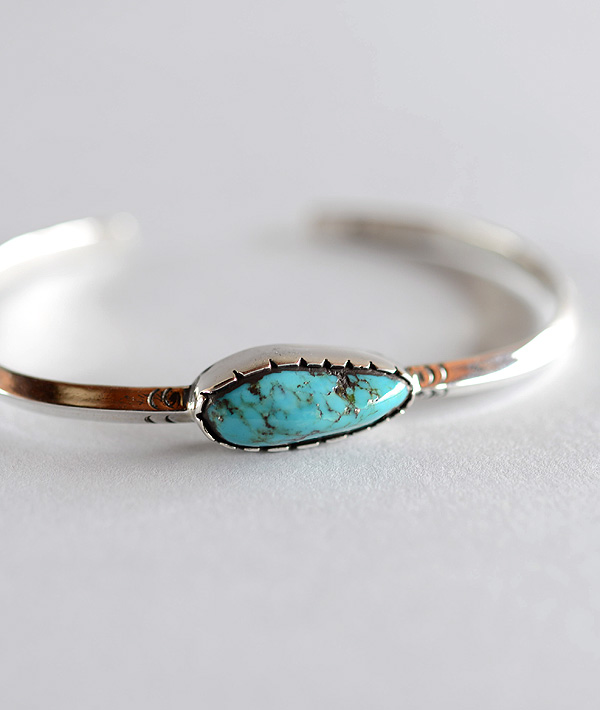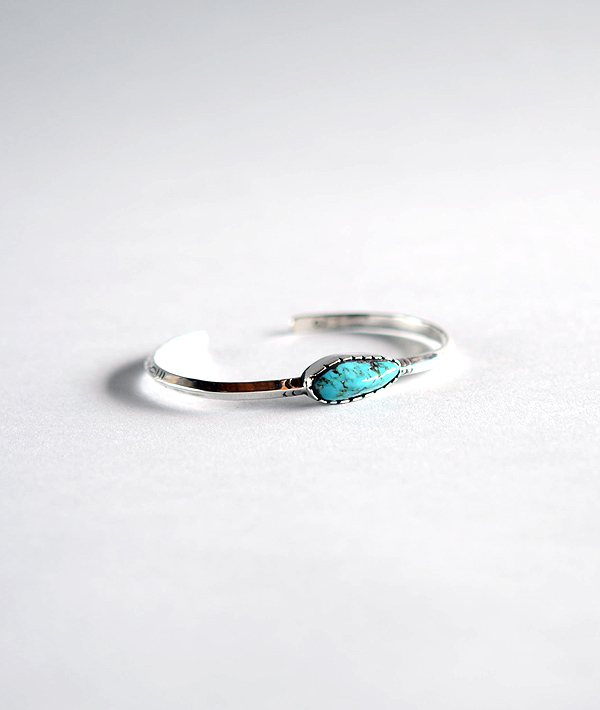 スッキリとしたトライアングルワイヤーに大粒のターコイズを載せたシンプルなバングル。ターコイズストーンが際立つデザインです。