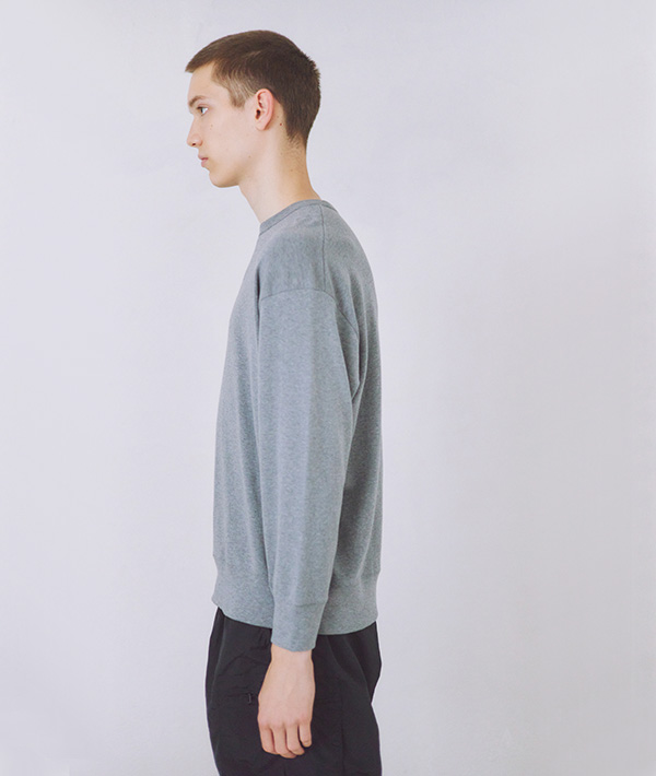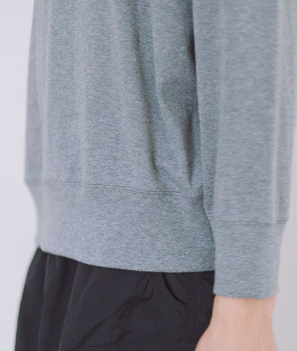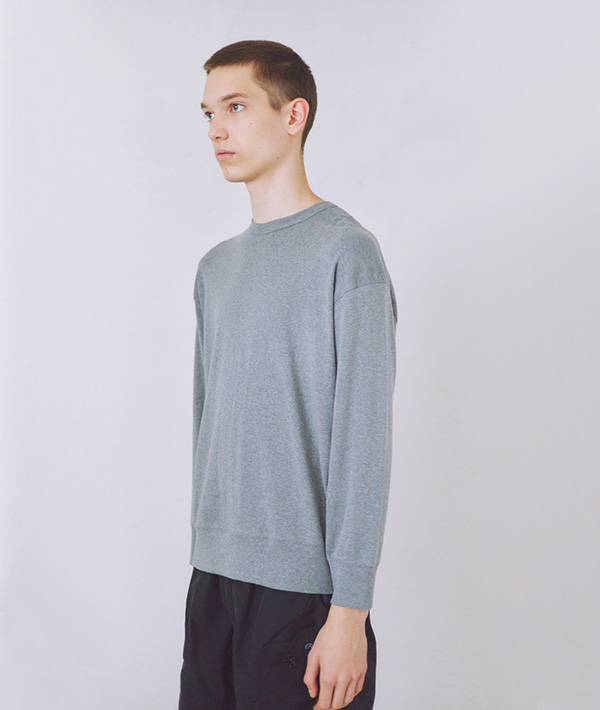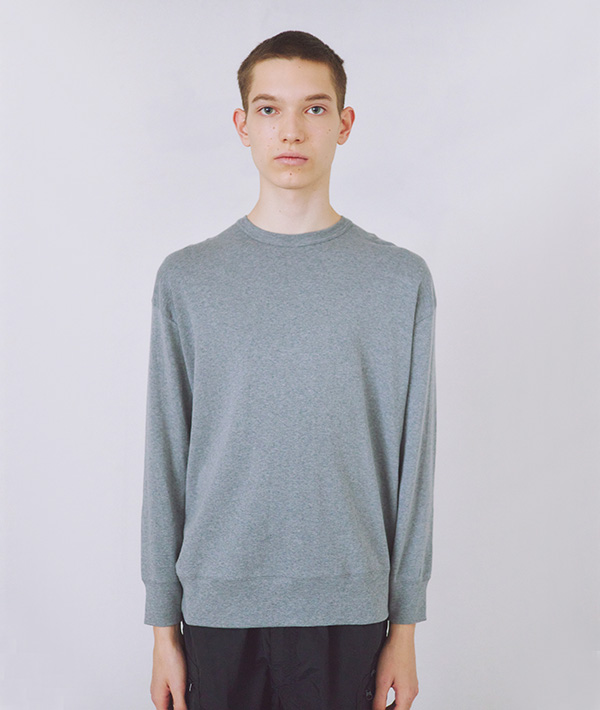 クルーネックロングスリーブTシャツ。シルエットはややリラックス感のあるフィット感でインナー使いにはもちろん、1枚で着ても様になります。袖は1×1リブ付きなのでさっと腕をまくってもよし、シンプルに大人っぽいワンランク上のカジュアルウェアです。裾は8cm幅ダブルの1×1リブになっており、スウェット感覚で着用していただけます。柔らかく肌になじむフライス素材は着心地抜群、また色々なスタイリングにも合わせられるので定番アイテムとしてワードローブに欠かせない大変便利なアイテムです。