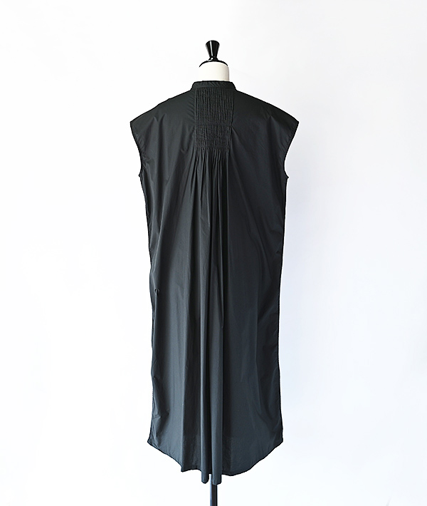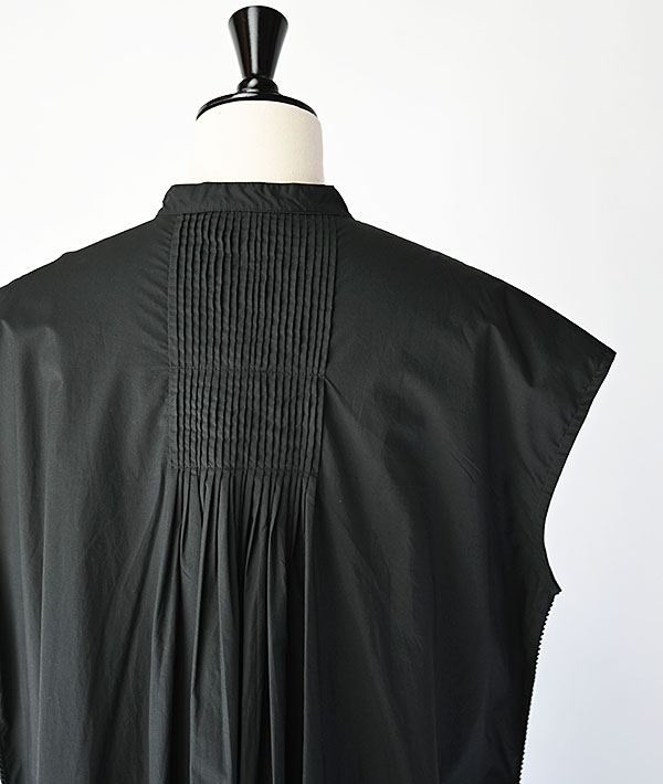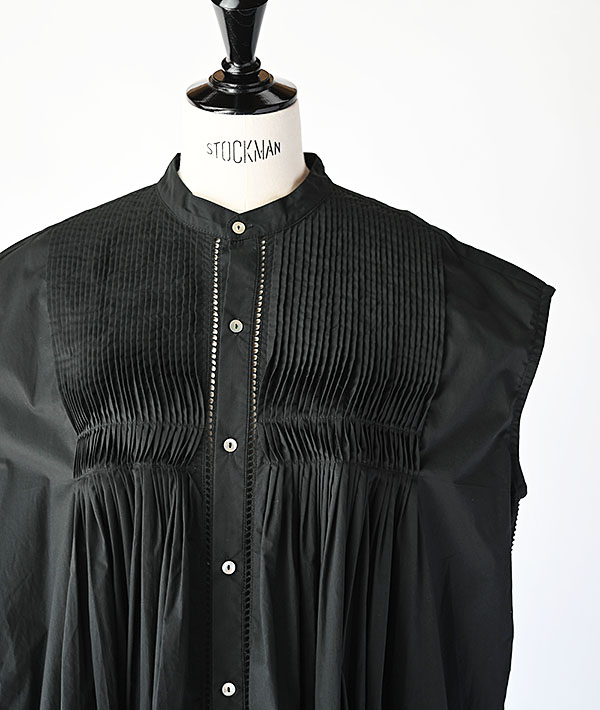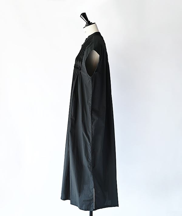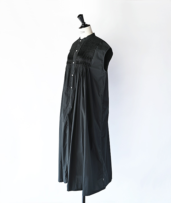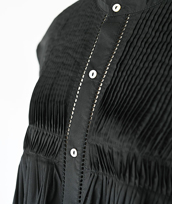 前身頃と後身頃にふんだんに施されたピンタックやハシゴレースと繊細なディテールが盛り込まれたフレンチスリーブのシャツワンピース。一着製作するにあたり1.5日も時間を要し、一着一着手作業でピンタックを施した非常に手の込んだ一着になります。フロント釦を外して羽織れば、スタイリングのアクセントとしても活躍するアイテムです。素材にはハイカウントの糸を使用し、打ち込みがよくハリ感が特徴のタイプライタークロスを使用。肌にまとわりつきにくいサラリとした感触もポイントです。