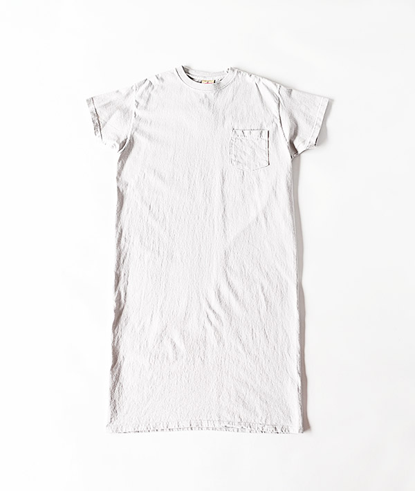 こちらは、7.2オンスのヘビーウェイトコットンジャージーで作られたロングワンピース。身幅を同ブランドのLサイズの丸胴に設定し、ゆったりとした着心地に仕上げています。厚手で透けにくい素材感で、着こむほどに風合いが増すのも特徴。肩先はリラックス感あるドロップスリーブになっています。