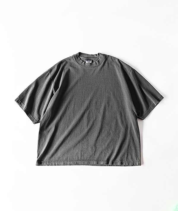 100% USコットンを使用した7.5ozのヘビーウェイトTシャツ。身幅にたっぷりとしたゆとりを持たせ、丈感を短く設定することで、ゆったりとしたボックス型のシルエットが楽しめるドロップショルダータイプのTシャツです。ガーメントダイの雰囲気も抜群でVINTAGEの様な風合いも感じられる一着です。