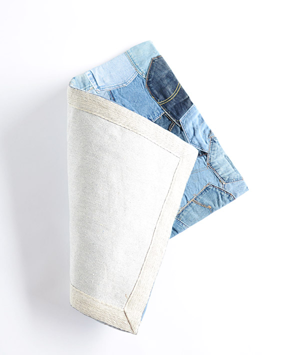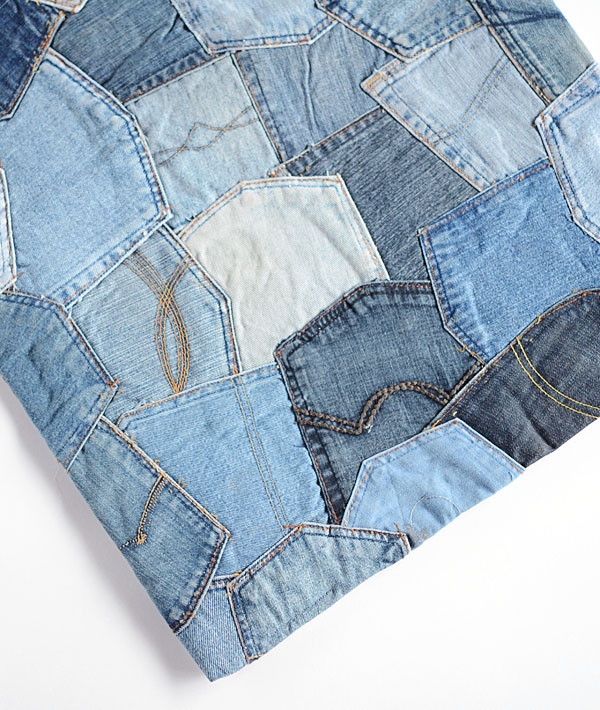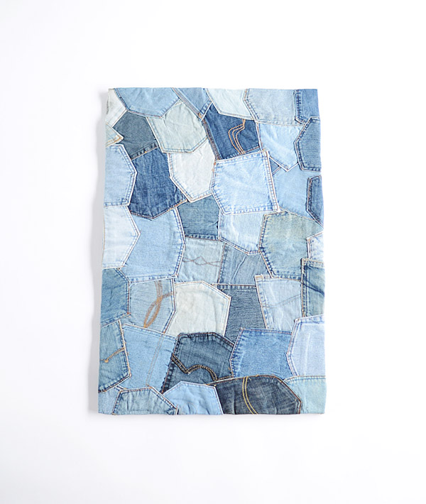 様々な銘柄のジーンズのバックポケットをランダムにパッチワークしたラグマット。こちらはスモールサイズです。