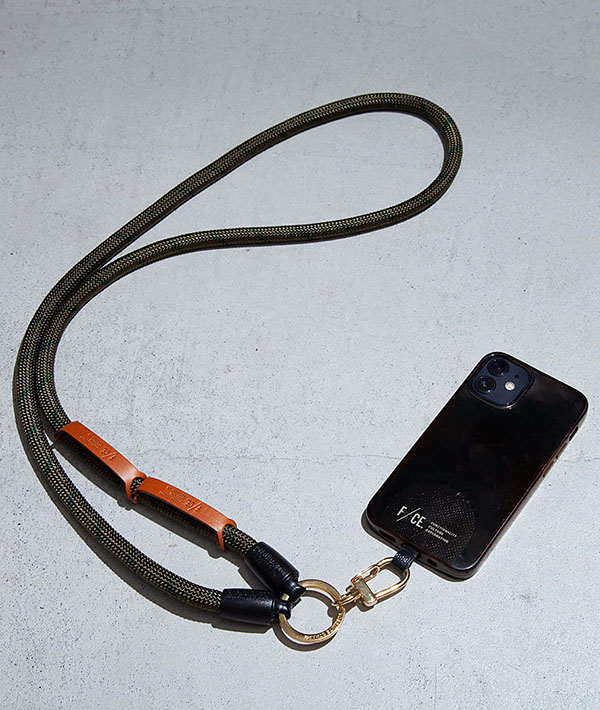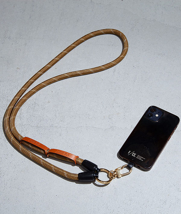 クライミングロープを使用したスマートフォン用モバイルストラップ。お使いのスマホケースにはさむだけ。ロープを結ぶ事でサイズ調節が可能。付属のレザー製フックパーツにキーホルダー等を装着できます。アタッチメントはコラボレーション限定仕様。装着したままで充電が出来ます。