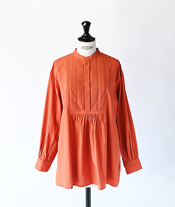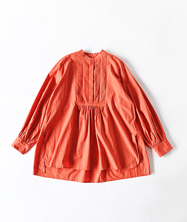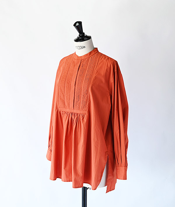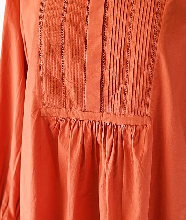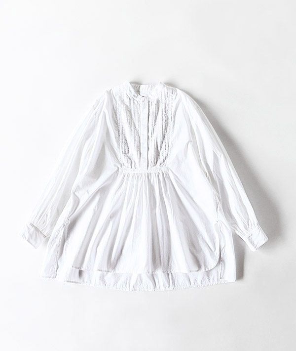 前身頃の切り替えに繊細なピンタックとはしごレースが施されたブザムシャツ。パウダータッチのコットンポプリンを洗いざらしにした素材は、肌あたりも良く季節を問わず使用していただけます。ワイドシルエットにサイドスリットでニュアンス感を演出しています。