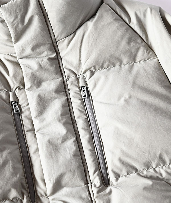 ジャケットや寝袋、布団から羽毛を回収され丁寧に再洗浄された650フィルパワーのダウン(河田フェザー)を使用し、街中や日常生活での使用に最適なパフォーマンスを発揮します。ミニマルなデザインで、軽量で、ボリューム感ある仕上がりになっています。表地には、リサイクルナイロンを使用、タテ糸にリサイクルナイロン糸、ヨコ糸にオーガニックコットン糸を使用し、高密度に織ることで、ドライでマットな仕上がりになっています。また、後加工でフッ素フリー撥水加工を施し環境にも配慮。ダウンプルーフ加工も施されているため、毛が抜けにくい素材を使用しています。