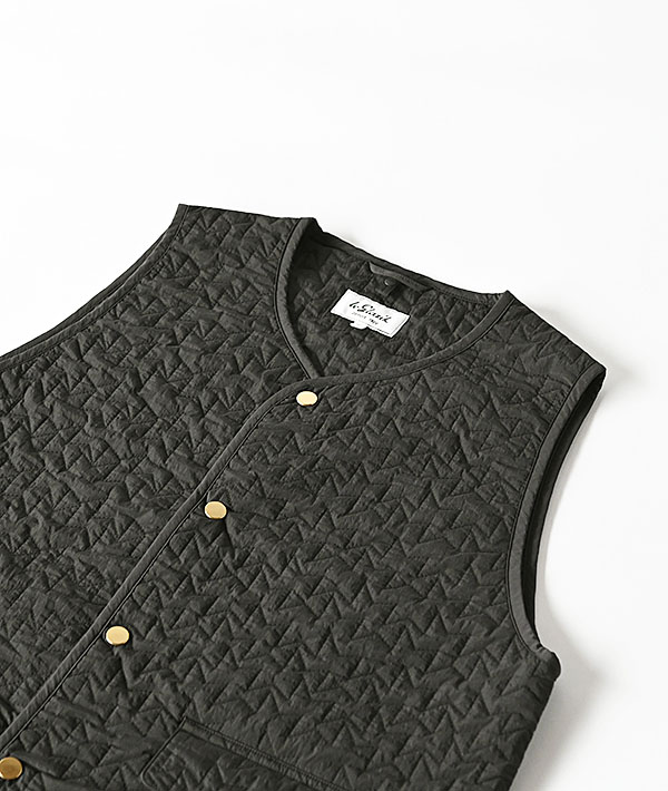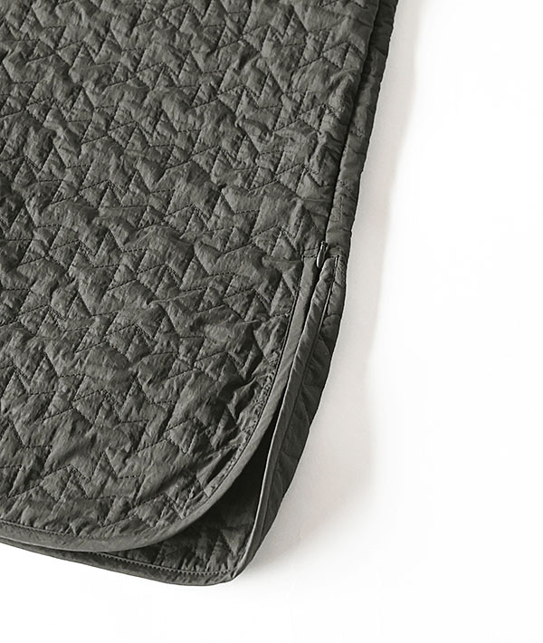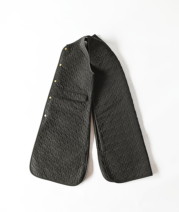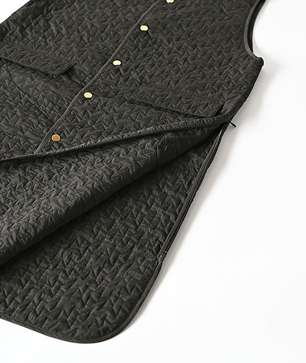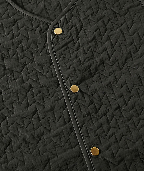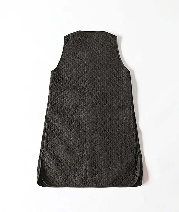 軽量で保温性の高い中綿キルティングのノーカラーロングベスト。コンシールファスナー仕様の開閉可能なサイドスリッドとゴールドドットボタンがポイントで、幅広いスタイリングに取り入れていただけます。秋口はアウターとして、冬はミドルレイヤーとして、ロングシーズンで活躍するロングベストです。