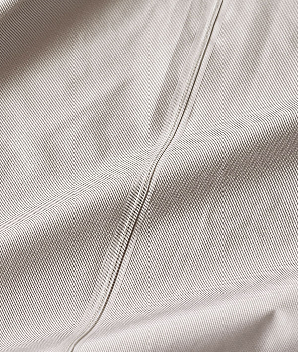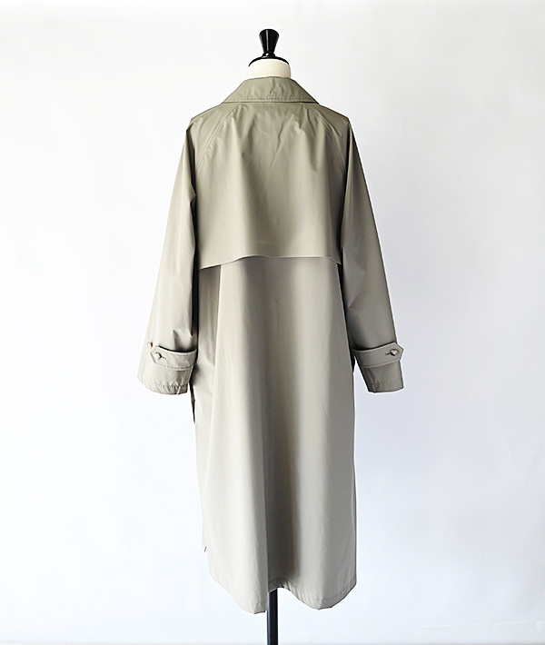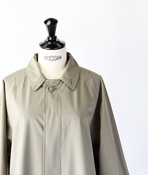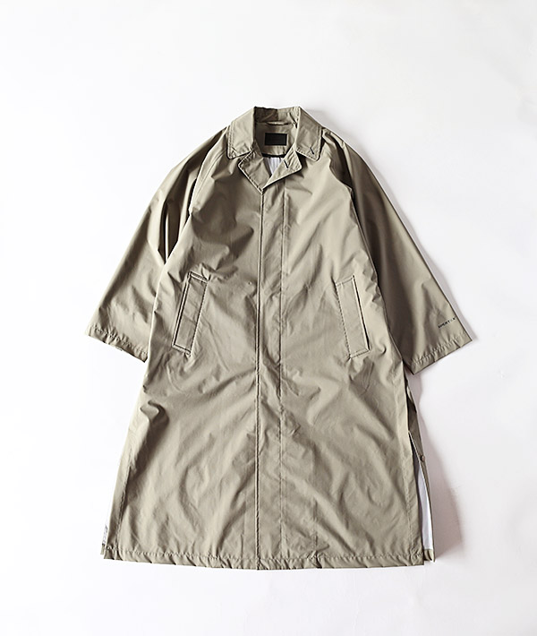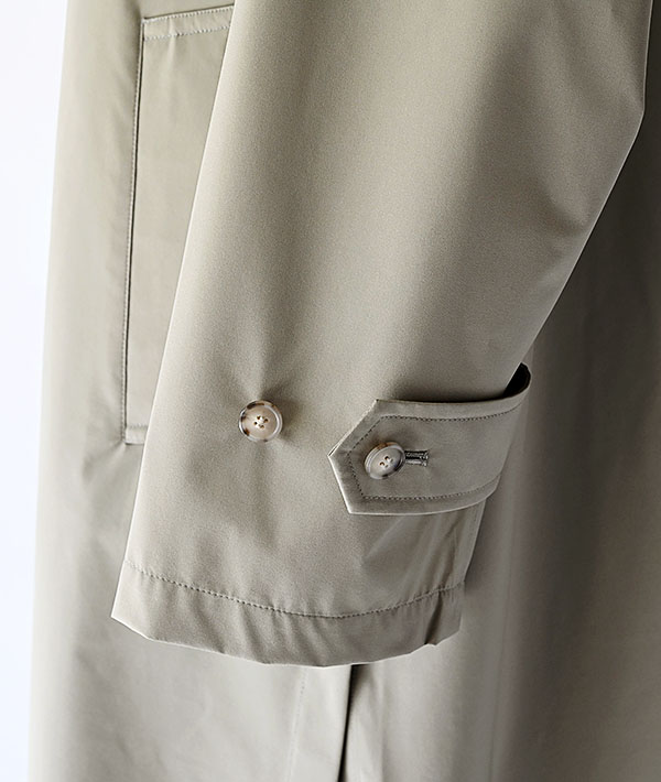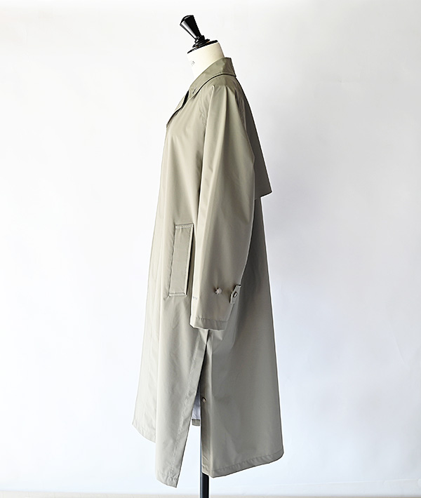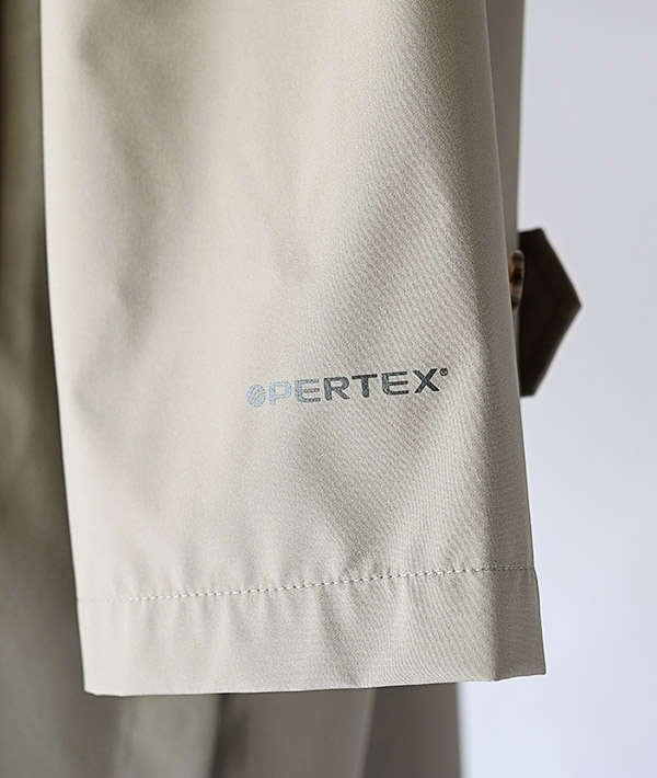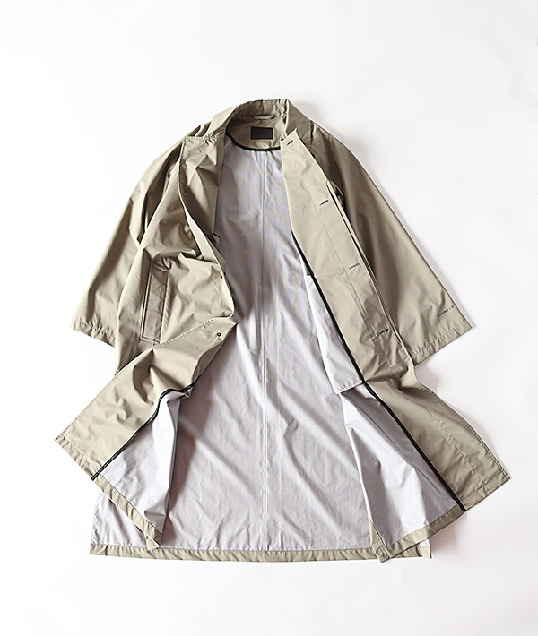 高機能素材PERTEX SHIELDを使用したバルマカーンコート。部分的に止水テープを施して撥水機能をもたせた仕様となります。ボタンの留め外しで印象の変化を楽しめる深めのサイドスリッドはコーディネートのアクセントになります。一年を通して活躍する優れた撥水性のコートです。