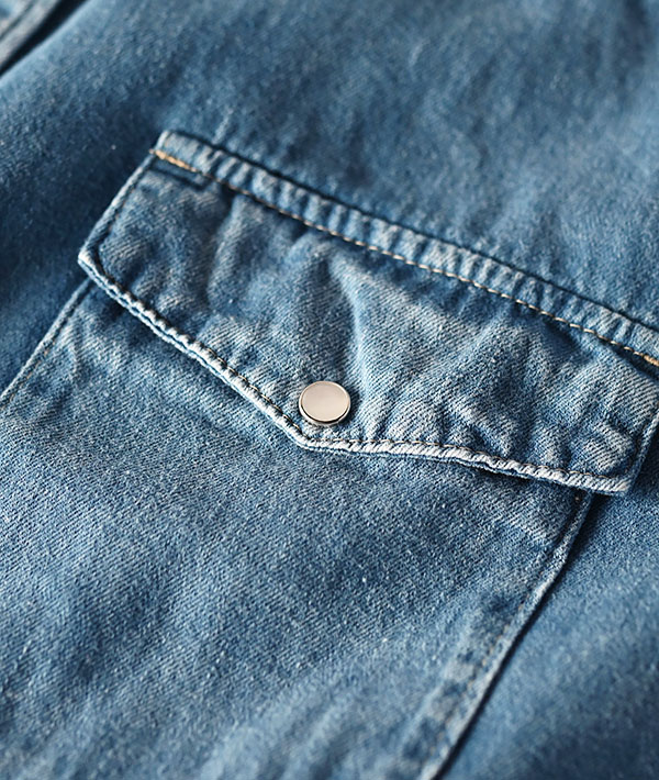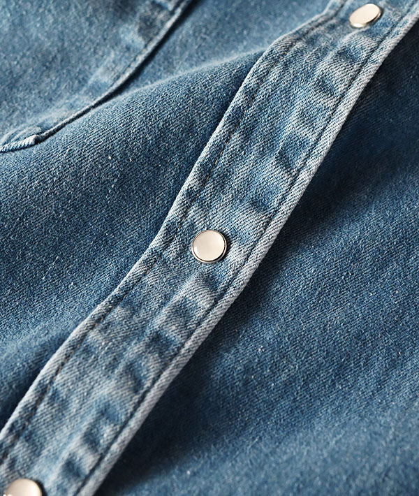 6オンスのカツラギデニムを使用した、レディースのウエスタンシャツ。3/1綾織り組織のしっかりとした経糸のインディゴ糸の表情が特徴。ウイメンズ用に着丈や袖などのバランスを整えて少しオーバーサイズで程よいリラックス感のあるシルエットです。スナップボタンを一般的なサイズより少し小さくして、すっきりと品の良い印象です。製品洗いを施し、きれいなサックスブルーに色落ちしています。長年愛用して柔らかく風合いの増したような自然な表情が魅力です。