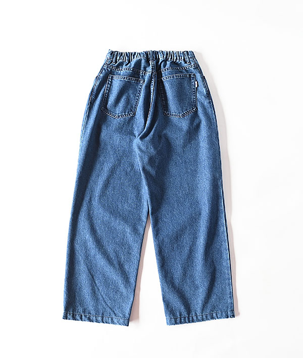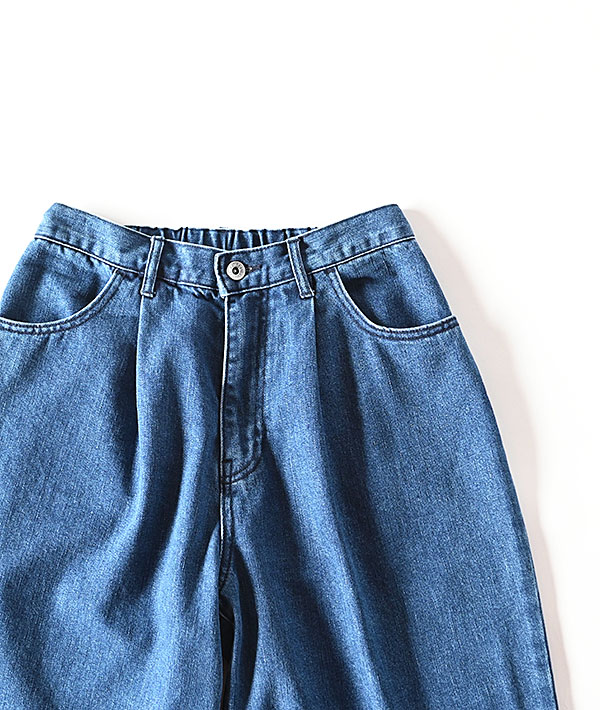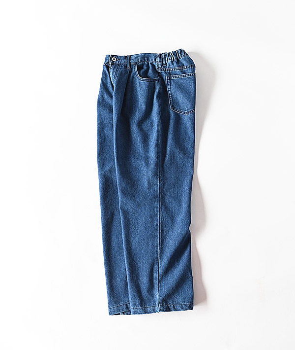 速乾性が高く夏期でも過ごしやすいライトウェイトのコットンポリエステルデニム素材を使用した、デニムイージーパンツ。フロントに大きなタックを入れた立体的なワイドシルエット。ウエストバックにゴムを配したイージー仕様で快適な履き心地です。