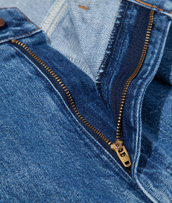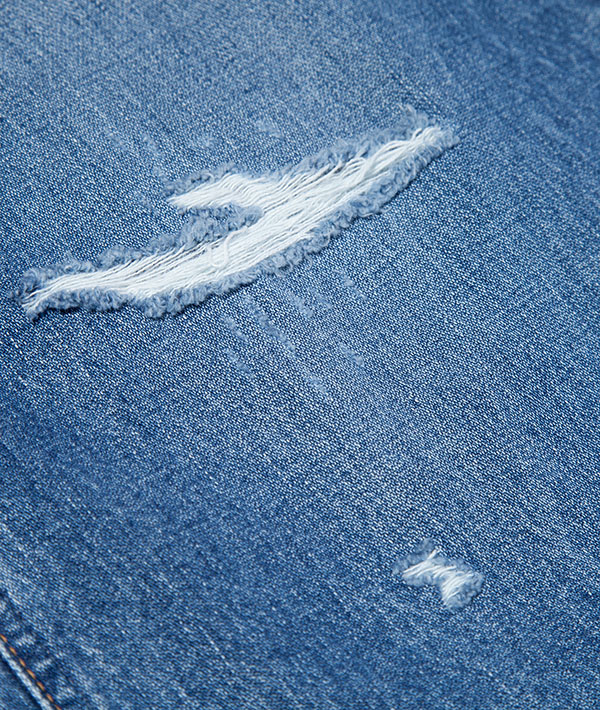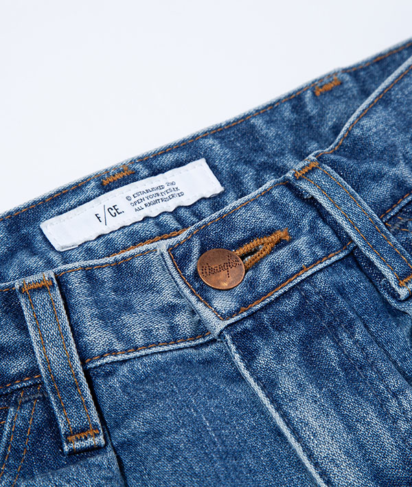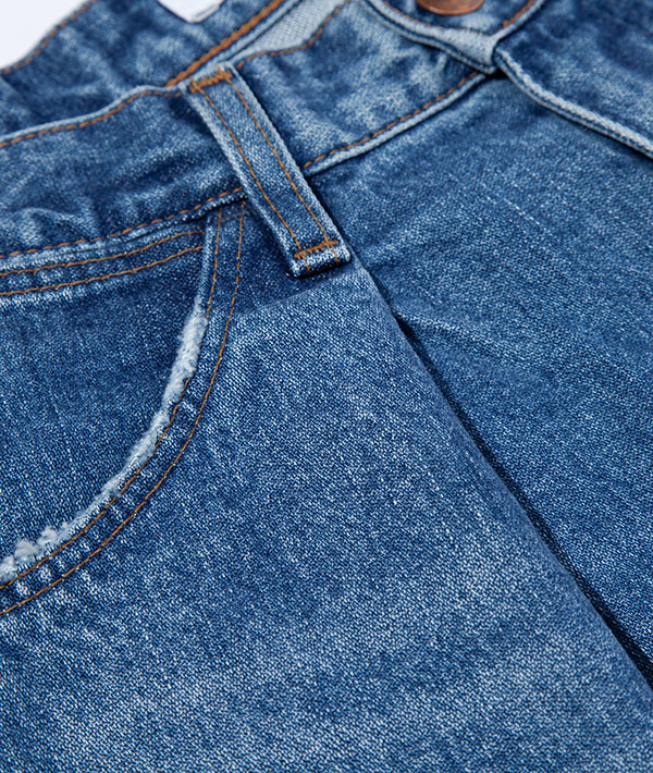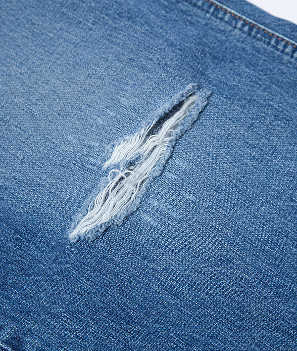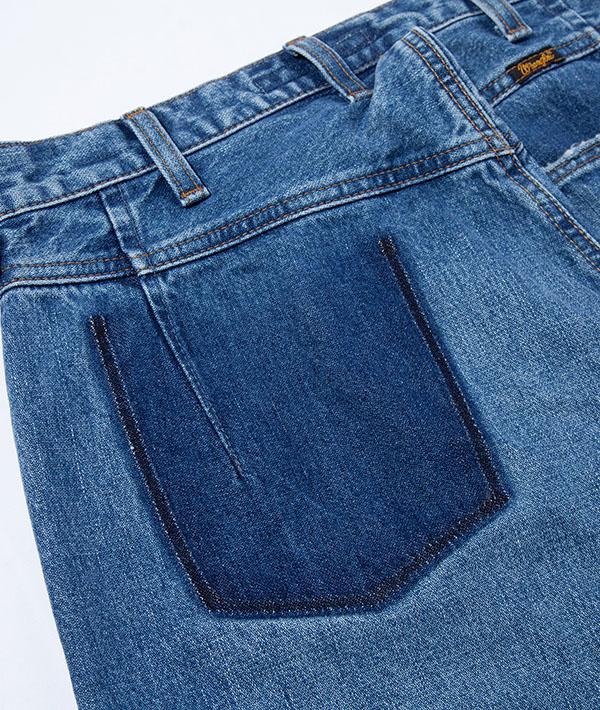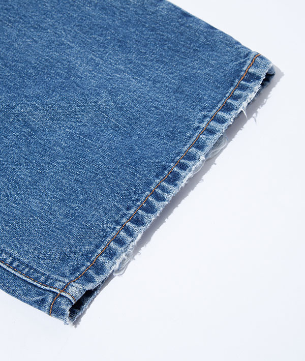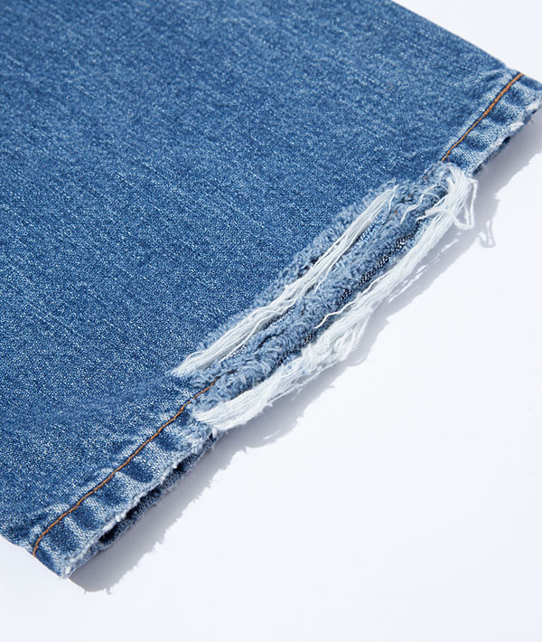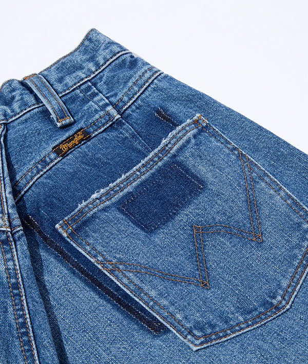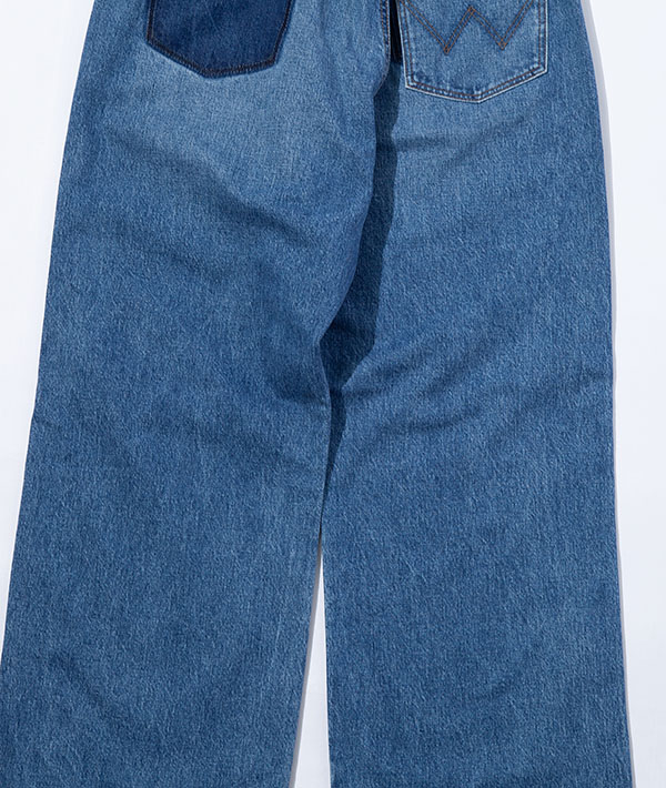Wranglerの代名詞と言えるブロークンデニムを使用した、リメイク風デニムパンツ。数十年デニムを着用したイメージを再現。タテ糸にムラ糸を用いてしっかりとした加工感を生み出しています。デニムながらも品のある印象を与える落ち感が特徴的です。