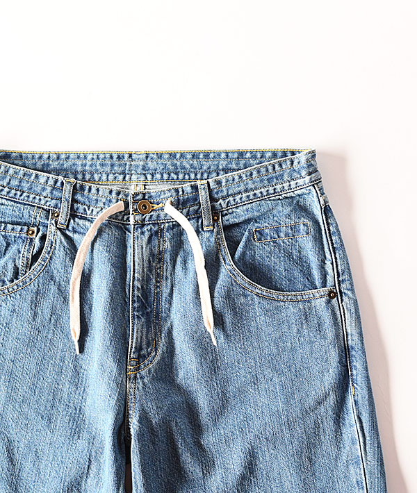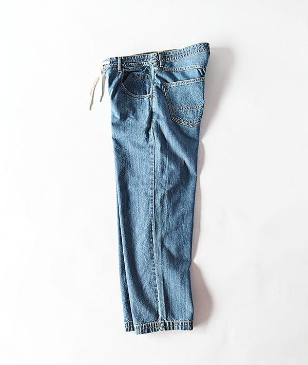 縦落ちが綺麗に出る11ozのカイハラデニムを用いたデニムパンツ。内側にも外側にも出し入れできるウエストのドローコードでイージーパンツ使いも可能。バックポケットは補強布をポケットのボトムに忍ばせていて財布などの摩擦にも対応。ウエストと裾はチェーンステッチで仕上げられ、穿いていく内に色落ちとアタリが味わえます。