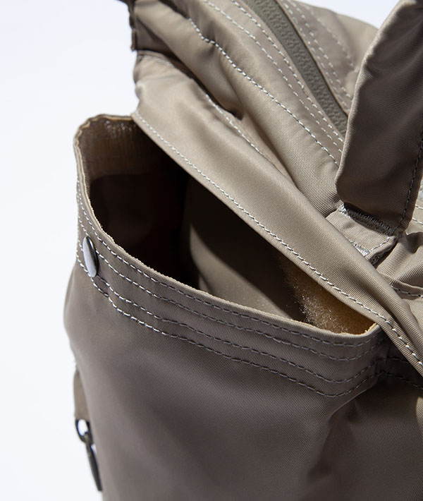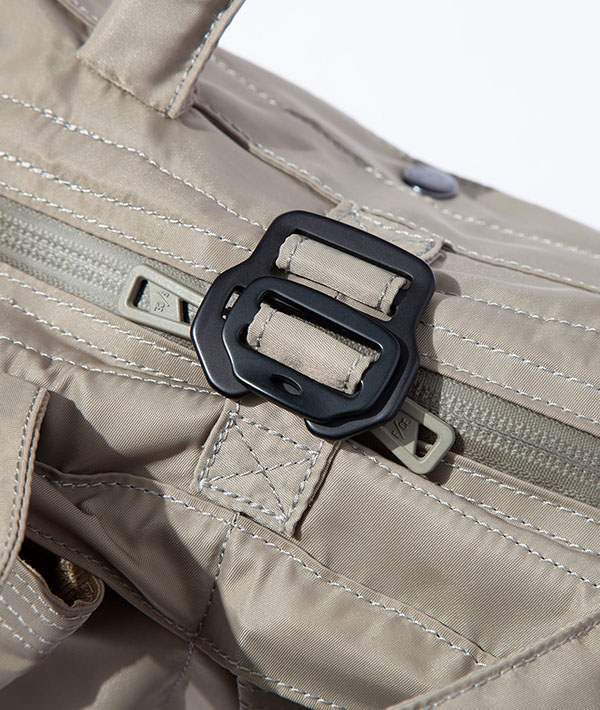 ヘルメットバッグの歴史としては第二次世界対戦の終わり間際に登場し、現在に至るまで幾度かのモデルが登場しています。オリジナルモデルを現代的にアップデートし、スモールサイズは、ショルダー、ハンドルの2wayの仕様で提案。マルチガジェットポケットを内装に装備。フロントのジッパーで、ポケット内に簡単にアクセス可能。ナイロンとリサイクルナイロンを混紡したし、ツイル組織の上品な印象に仕上げたサスティナブル素材を使用しています。容量6L。
