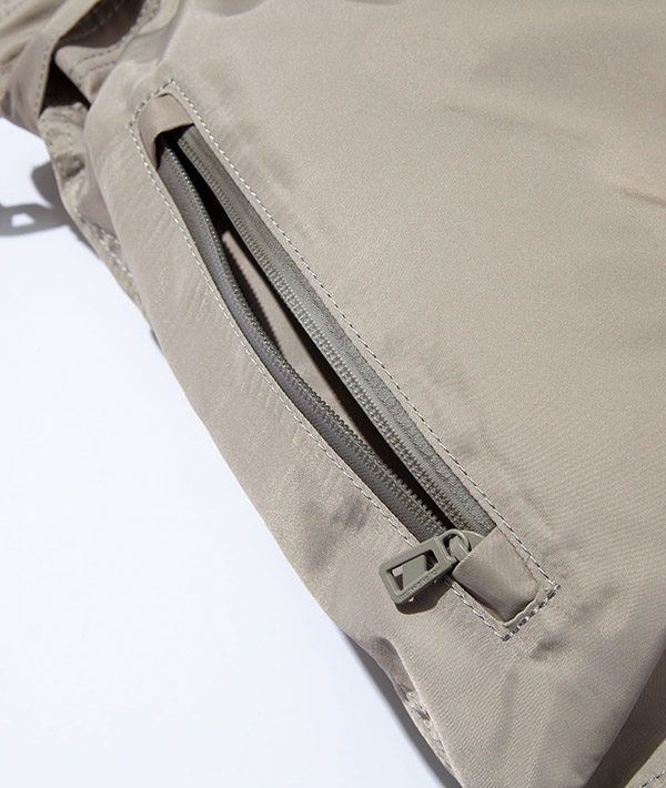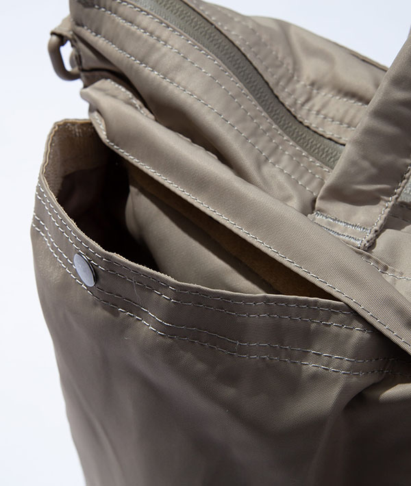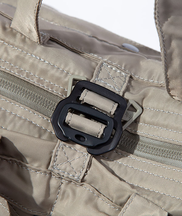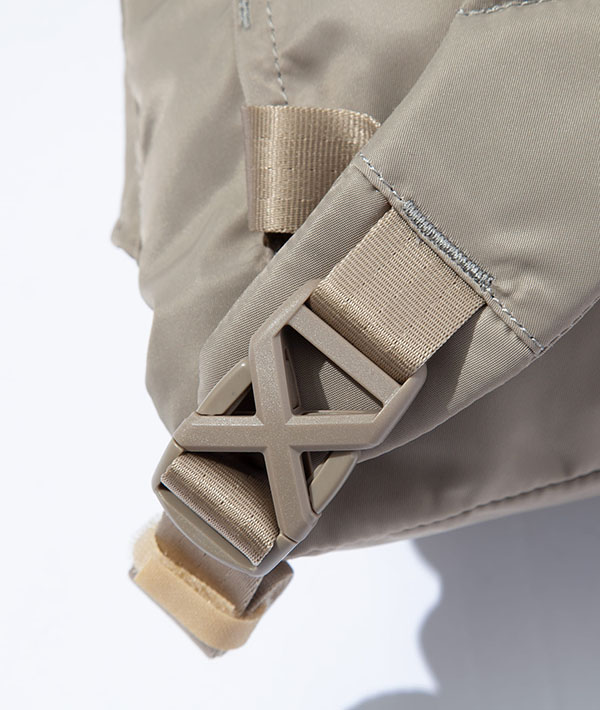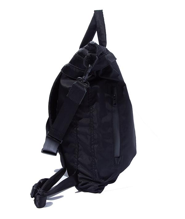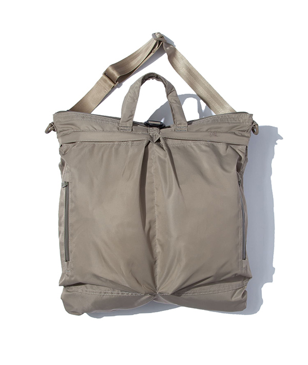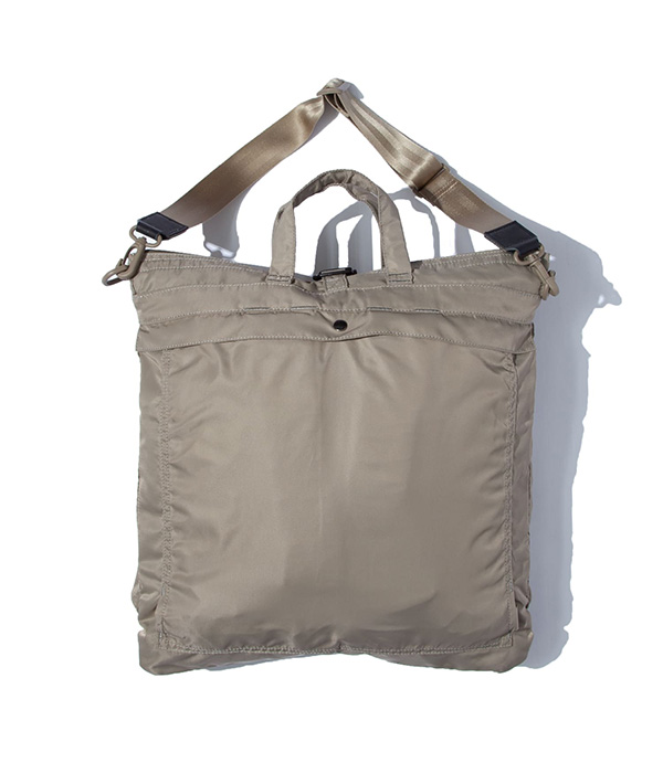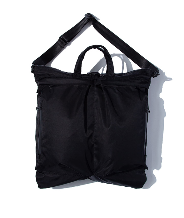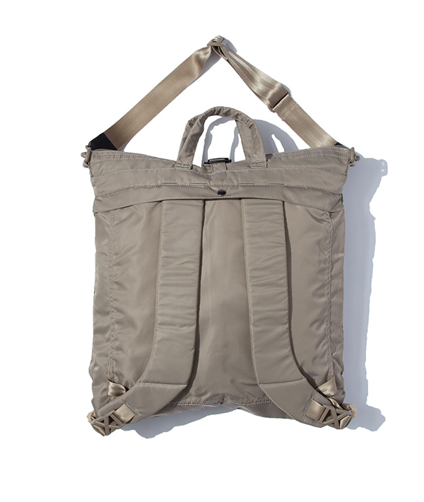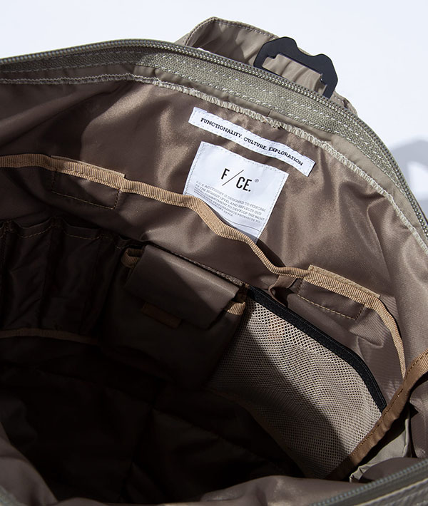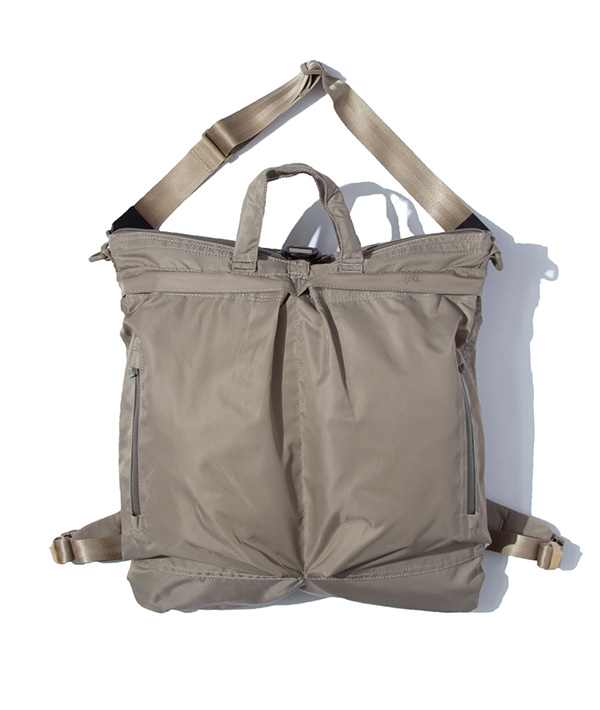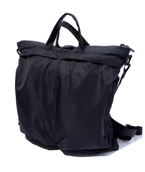 ヘルメットバッグの歴史としては第二次世界対戦の終わり間際に登場し、現在に至るまで幾度かのモデルが登場しています。オリジナルモデルを現代的にアップデートし、fceでは、ショルダー、バックパック、ハンドルの3wayの仕様で提案。タウンユースとしての設計は、15インチまでのPCケース、マルチガジェットポケットを内装に装備。フロントのジッパーで、ポケット内に簡単にアクセス可能。ナイロンとリサイクルナイロンを混紡したし、ツイル組織の上品な印象に仕上げたサスティナブル素材を使用しています。容量20L。