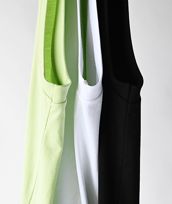さらっとした風合いで肌ざわりがよく、1枚で着ても気にならないちょうど良い脇のあき具合がポイント。女性らしく上品に着こなせる定番的アイテムです。型崩れしにくい双糸を採用、シンプルで着心地も快適なのでインナーとしても重宝します。肩の縫い目を少し後ろにずらしているので、正面から見た時にスッキリとした見栄えでカジュアルになりすぎず、オンオフどちらでも着ていただけます。