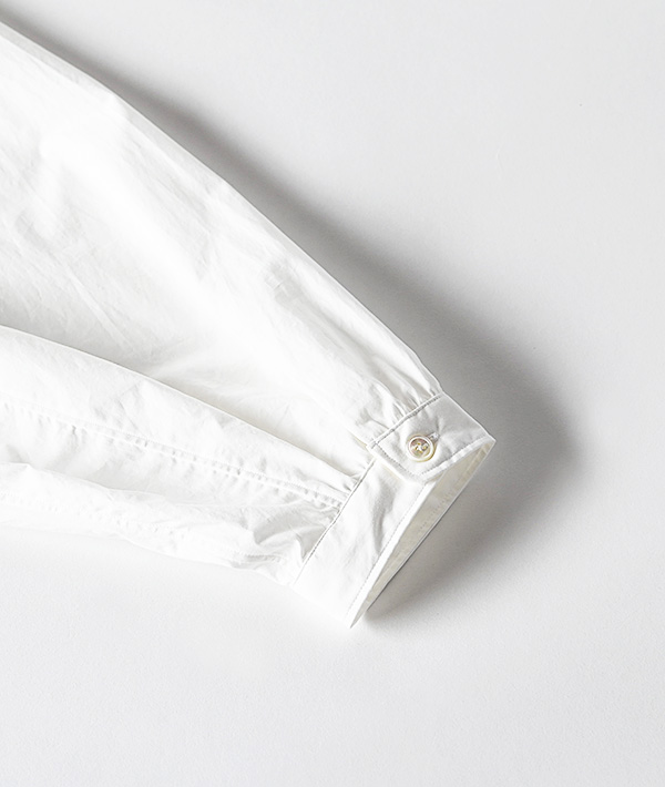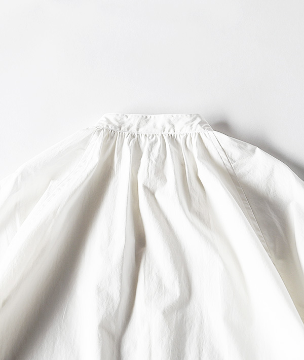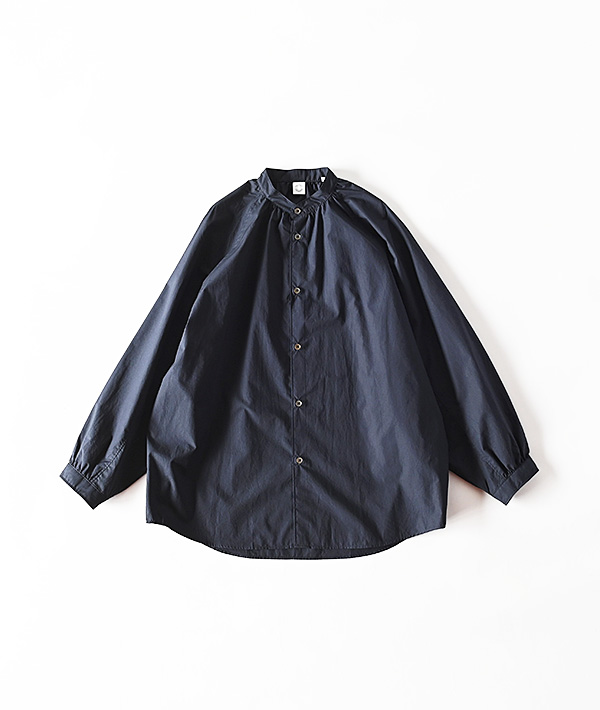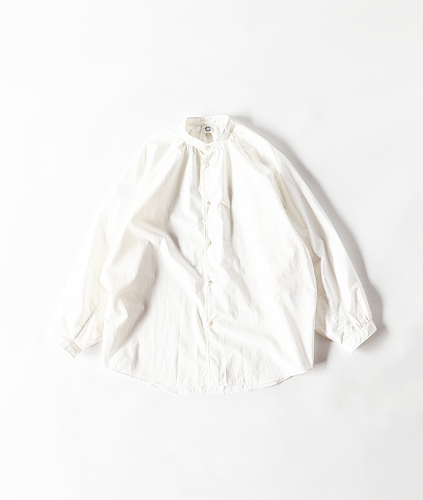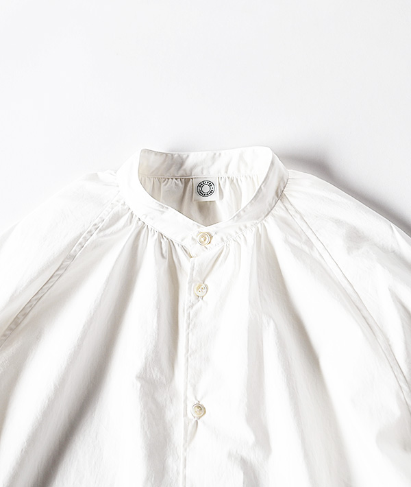オーガニックコットンを高密度に打ち込んだタイプライター素材を使用した、ラグランスリーブのバンドカラーシャツ。全体的にゆとりを持たせたシルエットに、襟元と袖口のギャザーデザインがポイントです。程よくハリのある素材で、デザインの甘さを軽減してカジュアルなボトム合わせもキレイめな装いにも対応する着回しの利く設計となっています。