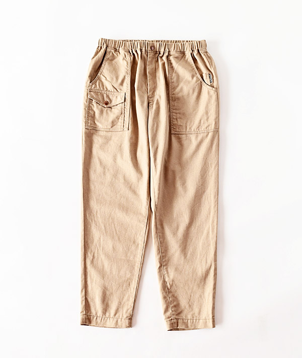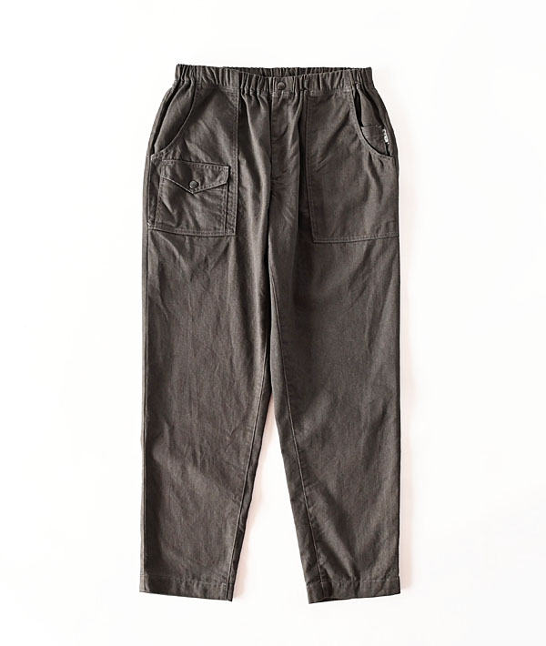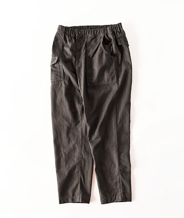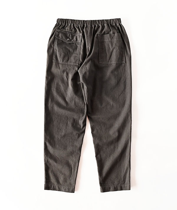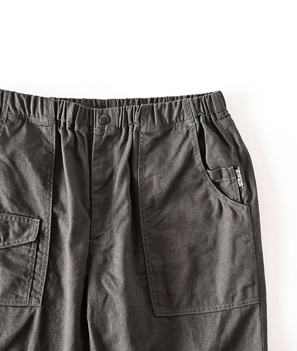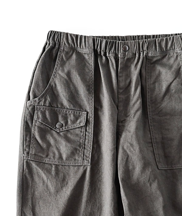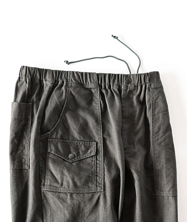 フェード感のあるソフトなコットンドリル素材を使用したイージータイプのブッシュパンツ。柔らかなコットン100%のツイル生地ですがナチュラルなストレッチ性があります。洗いを繰り返すことで生まれるムラ感を生地にプリントすることで表現した新しいアプローチの素材。ウエストゴム&ストリング仕様で楽に着られますが、メリハリのあるきれいなテーパードシルエットに仕上げています。